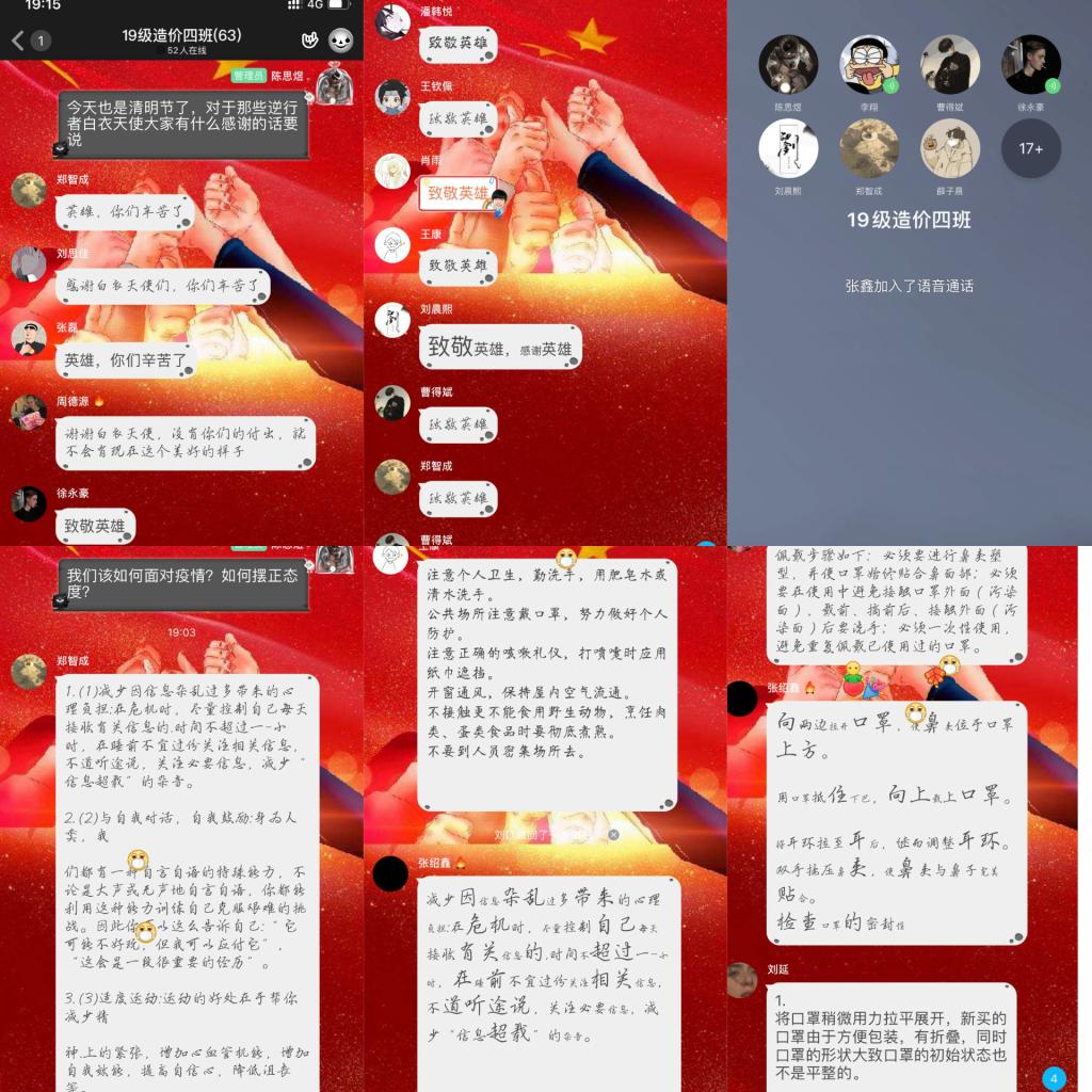 又是清明,疫情之下,这个遥寄哀思、悼亡怀人的日子也变得格外沉重。为表达全国各族人民对抗击新冠肺炎疫情斗争牺牲烈士和逝世同胞的深切哀悼,关爱疫情期间同学们的心理健康。建筑工程学院19造价四班于4月4日晚19:00采用线上通话的方式举办清明线上防疫活动。此次活动由团支书陈思煜主持,19造价4班全体成员参加。