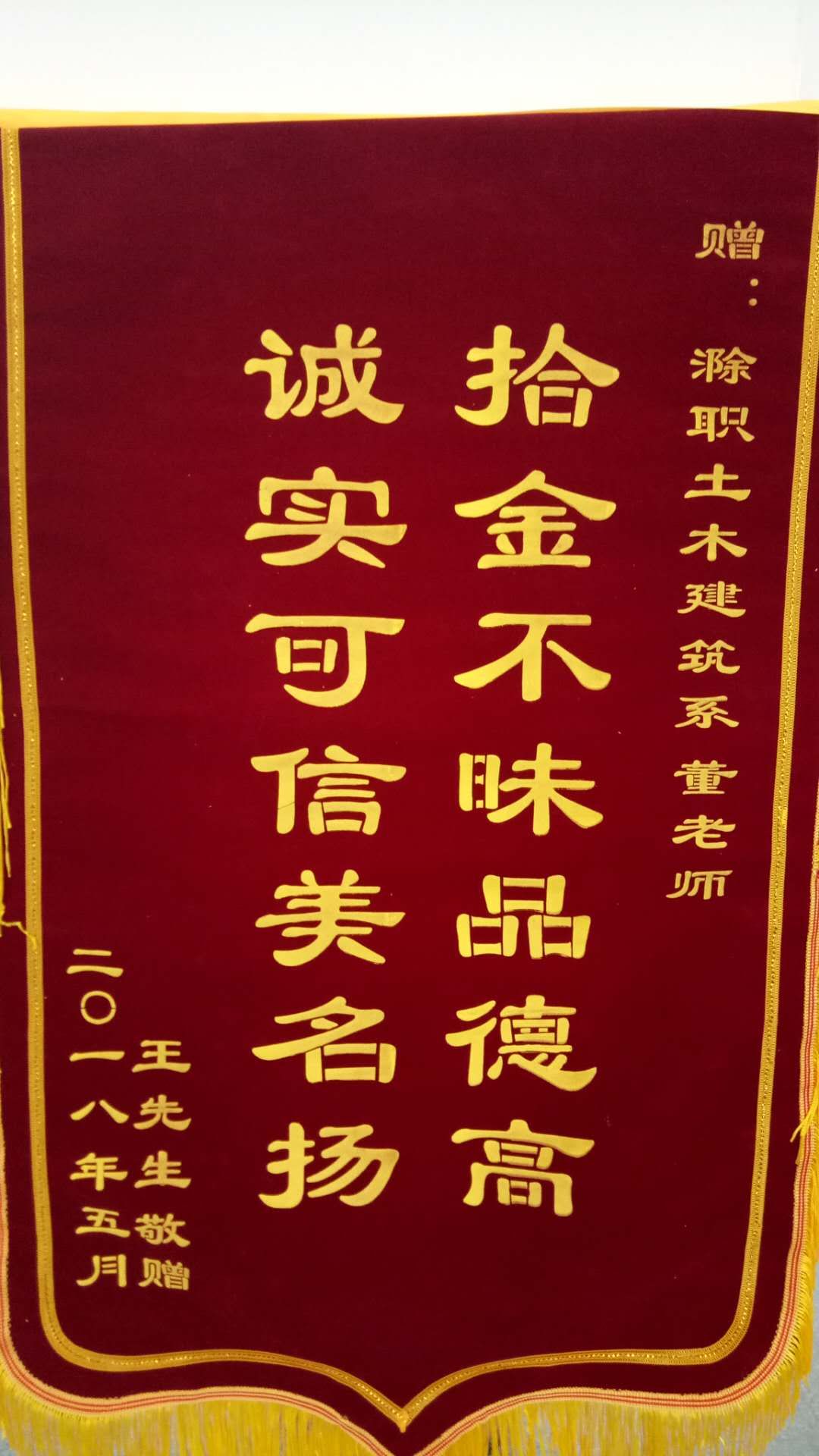 事后失主王先生亲自赶到学校,送来了印有“拾金不昧品德高、诚实可信美名扬”的锦旗表示感谢。