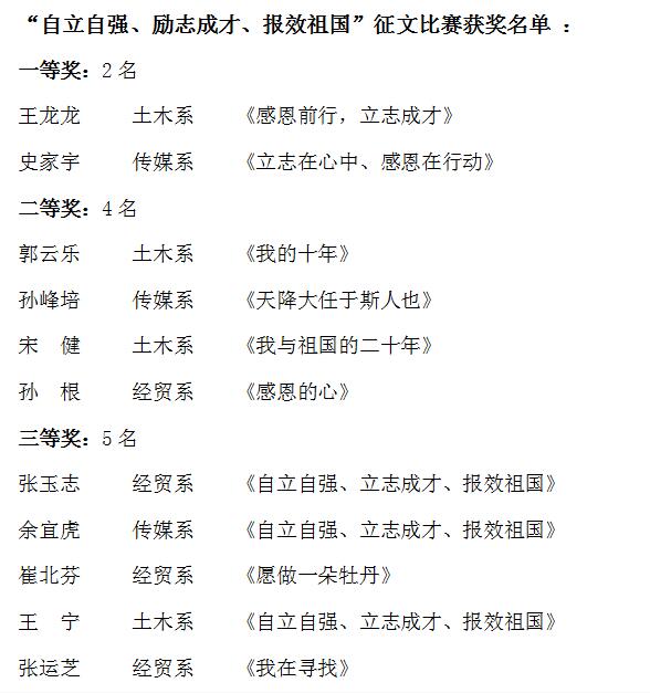 “自立自强、励志成才、报效祖国”大学生征文比赛是学院的一项传统赛事,距今已经成功举办了数年。本次比赛我系共有20余名同学积极参加,经过系里的认真评选,最后土木系报送的8篇征文全数获奖。