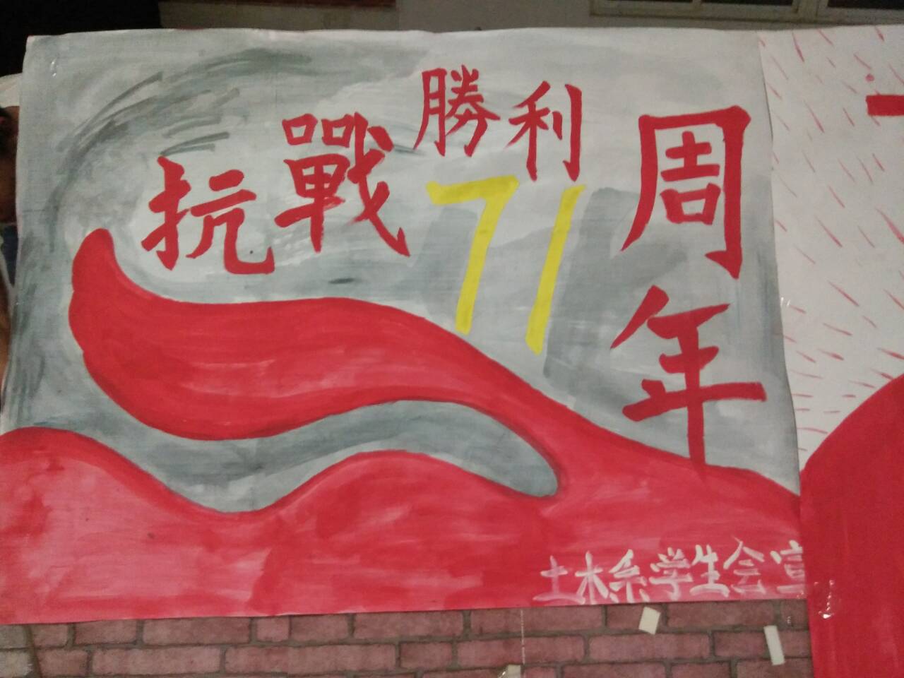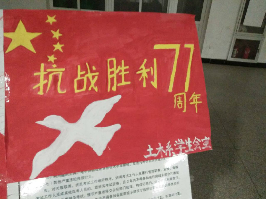 为纪念中国人民抗日战争暨世界反法西斯战争胜利71周年,进一步弘扬爱国主义精神,激发广大青年学生们的爱国情怀,近日,土木系利用多种形式开展抗日战争胜利71周年纪念活动。