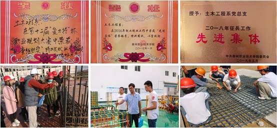 “十三五”期间,经过我院全体教职工的共同努力,以大滁城建设为依托,创建了“依托行业,理实交替”的人才培养模式;依据市场调查的数据,以岗位设置、项目引导,任务驱动为目标,对课程在横向和纵向进行引导,打破原有的课程体系,构建了专业项目化的课程体系;此外龙头专业——建筑工程技术专业的专业改革成果应用到其他专业,促进工程监理、道路与桥梁工程技术、物业管理等专业。为经过近五年的建设,我院的专业建设成效显著:建筑工程技术列入国家级高水平骨干专业建设计划,建筑工程实训中心获得省级示范实训中心,成为全国首批1+X试点单位(建筑信息模型和建筑工程识图技能两个X证书)同时,列入国家建筑工程识图技能等级证书考核站点。指导学生参加各项技能大赛,获得国家级三等奖三项、省级一等奖近十项、省级二等奖、三等奖若干项。