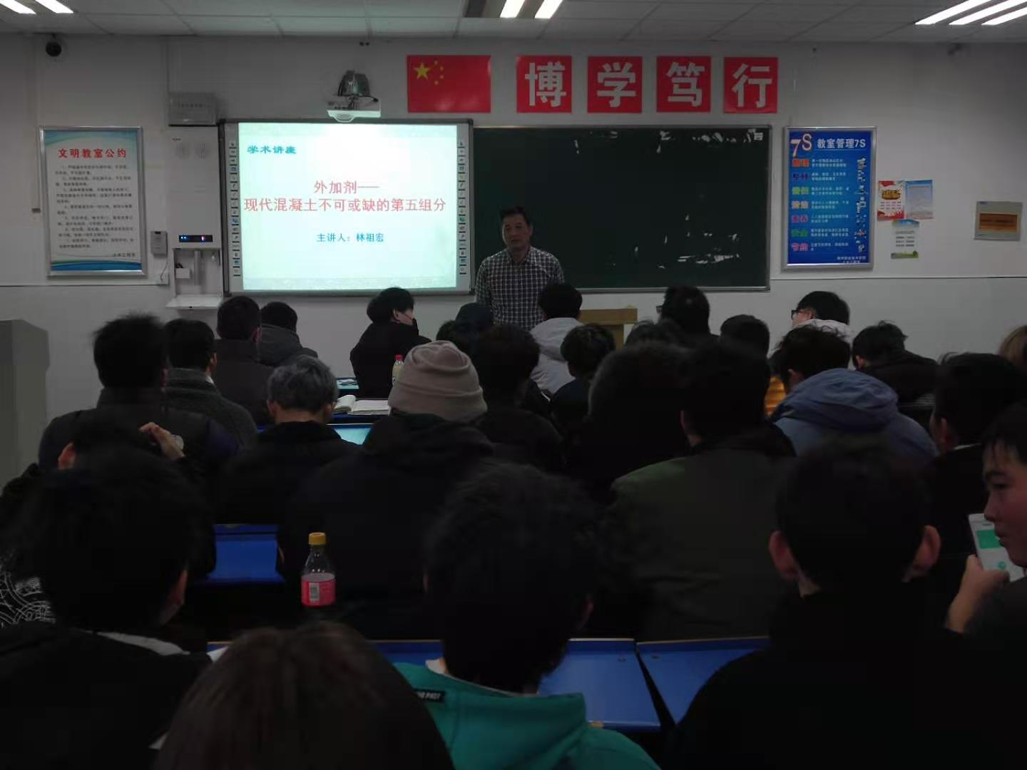 12月09日下午2:30至4:30,由学院致研建材社团主办的题为《外加剂一现代混凝土不可或缺第五组份》的学术报告会在教学楼4102室举行,建筑工程学院林祖宏教授在会上做了精彩报告。建筑工程学院相关专业近百余名学生聆听了报告。