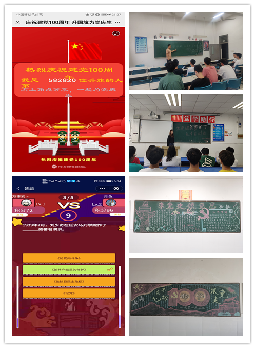主题教育活动以多途径、多形式开展,集合班级主题班会、专题学习会、学生会组织寻访红色革命遗址、主题黑板报评比、党史知识问答、升国旗为党庆生等项目。