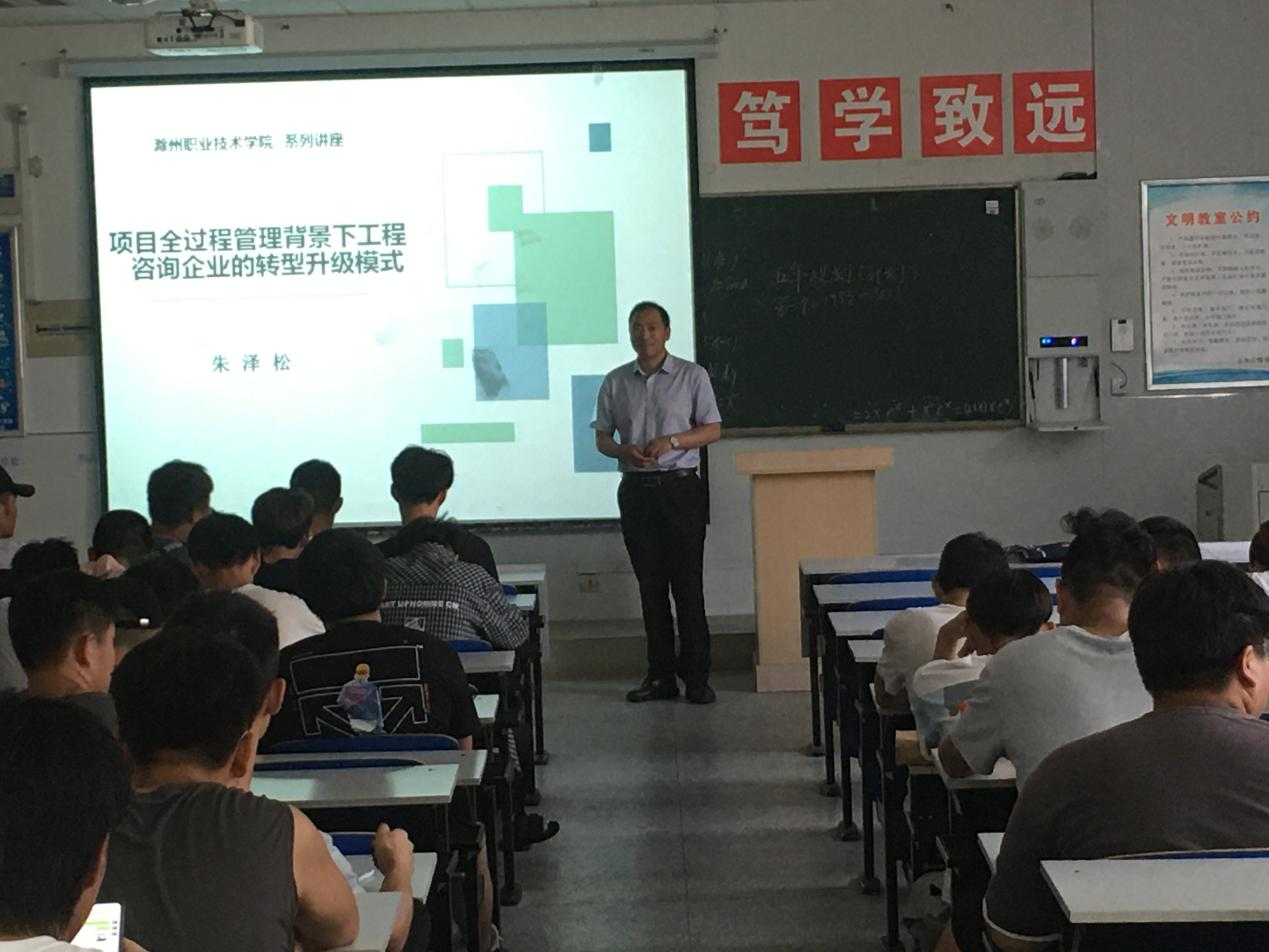 2021年6月2日下午13:30时,建筑工程学院朱泽松副教授在致学楼4110教室,举办题为“项目全过程管理背景下工程咨询企业的转型升级模式”的讲座,建筑工程学院建筑工程、工程监理和工程造价专业学生听取了讲座。