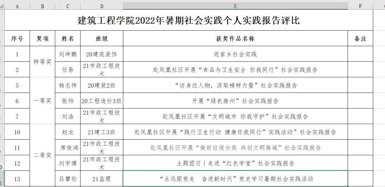 为了加强青年学生的理论知识和社会实践能力,充分发挥青年学生的知识技能优势。近日,建筑工程学院开展了2022年暑期社会实践报告评选工作,对来自11个班的50篇实践报告进行认真审核,层层选拔,评选出特等奖2个,一等奖2个,二等奖4个,三等奖10个,优秀奖17个。