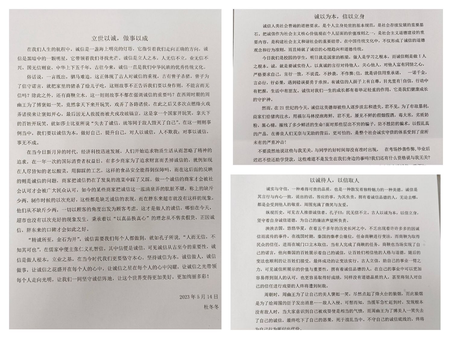 为了进一步提高学生的诚信意识,培养学生的诚信精神。巩固和深化诚信教育成果,引导学生讲诚信、树诚信、践诚信的观念。5月14日建筑工程学院学生会组织开展“以诚为本,以信立身”主题征文比赛。
