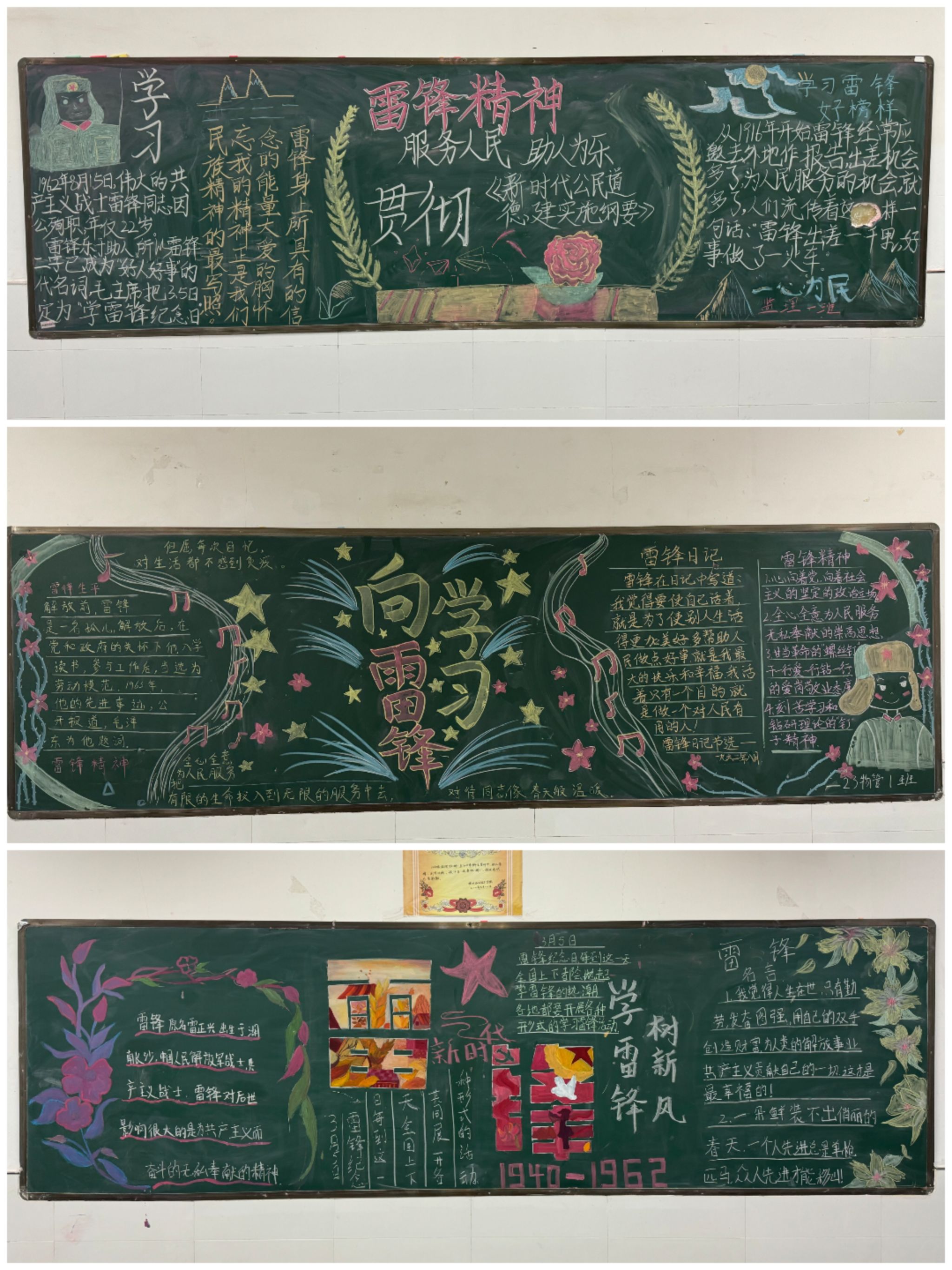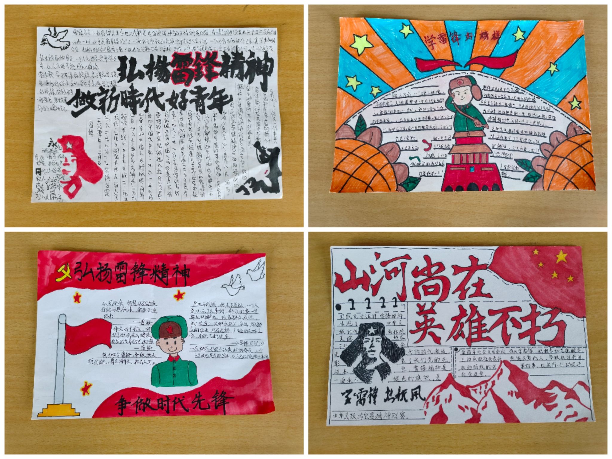 雷锋精神穿越时空、传承不息,影响塑造了无数中国人的心灵世界,激励着一代又一代中华儿女勇于担当、甘于奉献!在各班班委带领下,同学们以“学雷锋 树新风”“雷锋精神代代传”为主题,认真构思、积极寻找素材、精心设计,以实际行动弘扬雷锋精神,争做新时代好少年。其中内容健康向上,主题鲜明,图文并茂,美观得体。有的讴歌雷锋精神,有的宣传雷锋的感人事迹,有的收集雷锋名言录,多角度诠释了雷锋精神的内涵。让其他同学们对雷锋及其精神有了更多的了解。