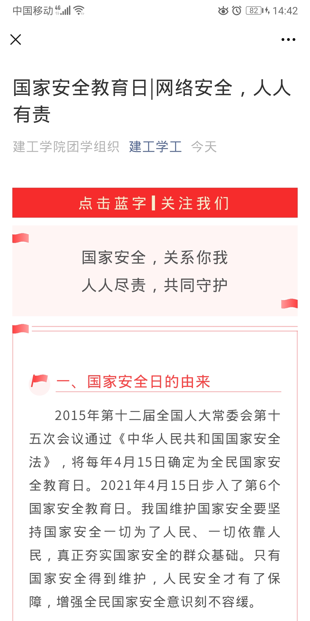 4月15日,是第六个“全民国家安全教育日”,为贯彻落实习近平总书记提出的“总体国家安全观”,建筑工程学院团总支通过多种形式开展以国家安全教育日为主题的团日活动,并通过团总支微信公众号推送相关资讯,积极促进广大团员青年了解、学习国家安全知识,树立安全意识,营造维护国家安全的浓厚法治氛围,真正做到“国家安全,人人有责”。