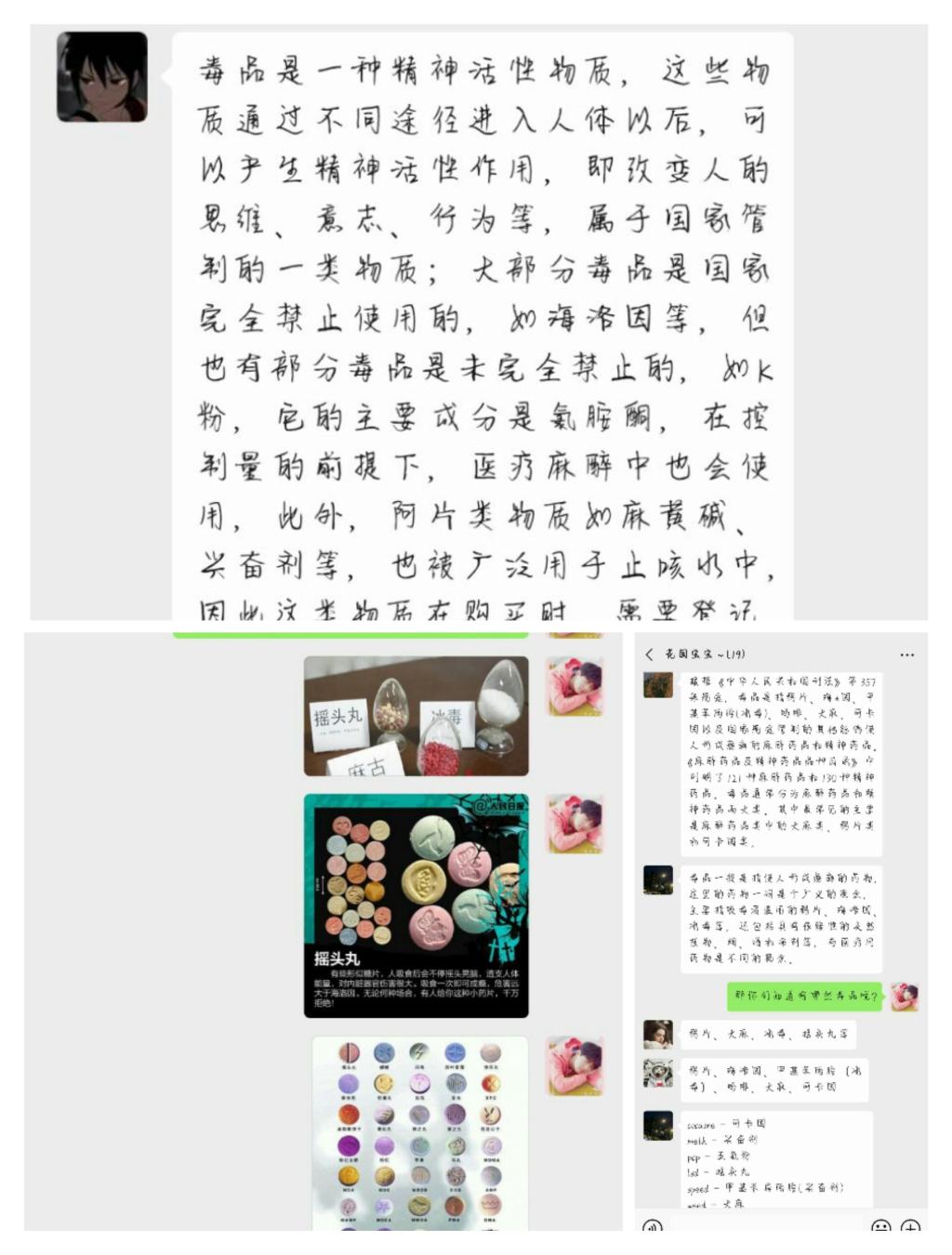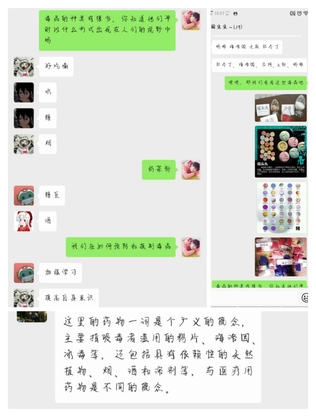 通过在微信上提问、图片宣传等形式,介绍毒品的危害,宣传毒品的有关知识及国家有关禁毒、禁烟的法律法规。以具体实例说明感染学生,毒品、吸烟不仅危害社会、危害个人和他人健康,还会毁灭家庭。因此加强对青少年学生禁毒、禁烟知识的宣传教育尤为重要,活动通过多媒体的演示形象生动地向学生们讲解毒品、吸烟的性质、特征以及危害,并用实实在在的案例教育同学们如何树立正确的人生观、价值观和法制观。