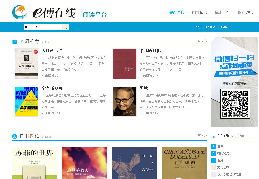 e博在线是一款专业的在线阅览平台,读者在该平台内能够免费阅读大量电子图书、电子期刊及电子报纸。为满足广大读者的阅读需求,目前,学院已开通试用版。读者可登陆学院网站首页,从首页下方的“快捷通道”直接点击进入。请读者朋友们相互转告,特此通知。