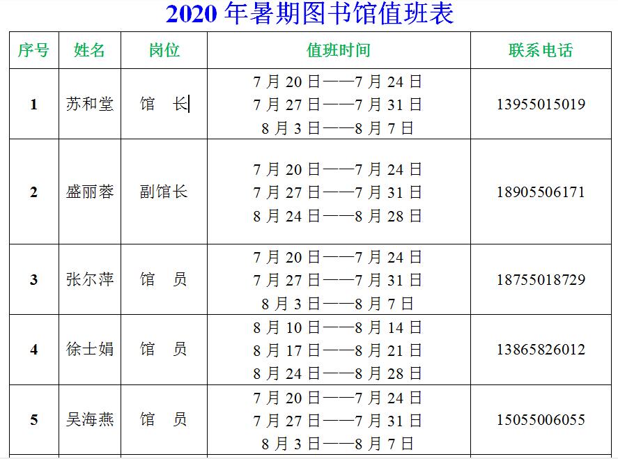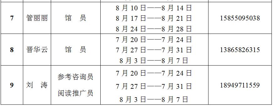 2020年暑期图书馆值班表