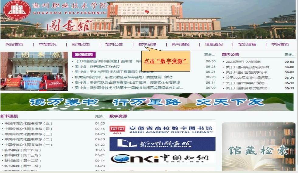 图1:访问步骤:先进入滁职图书馆网站主页,然后点击标题栏的“数字资源”