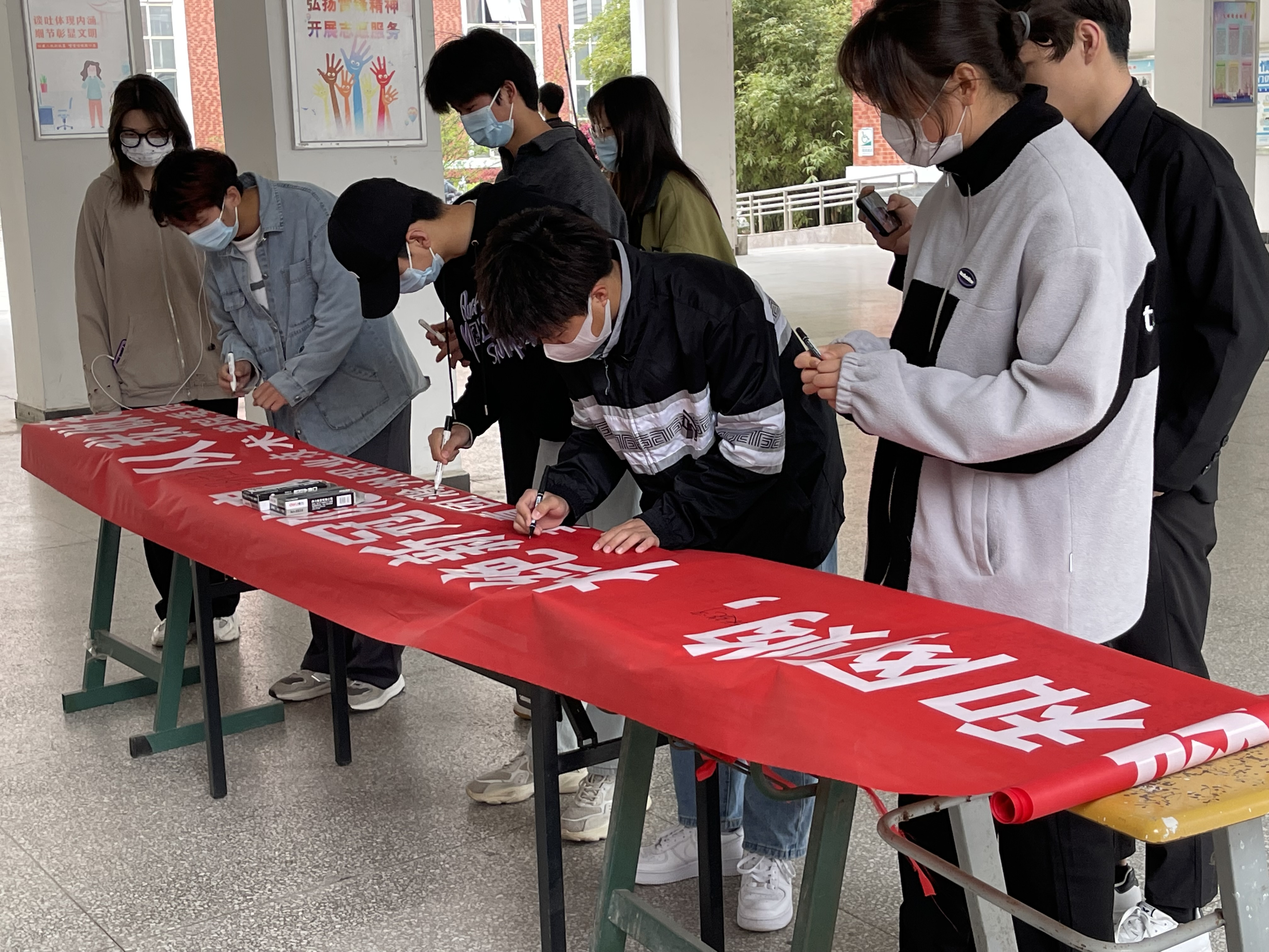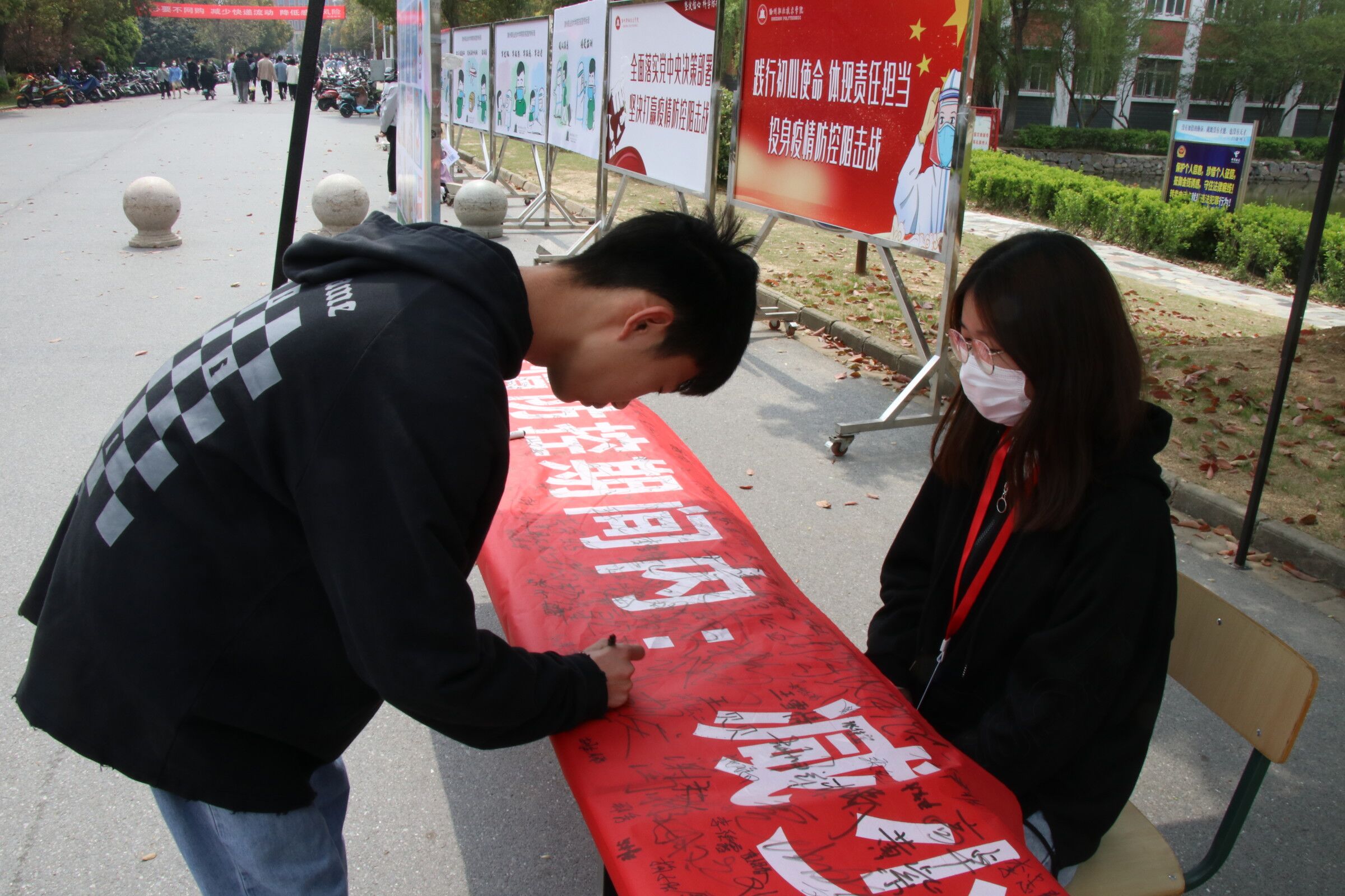 活动开始,社联主席维护场地秩序以及对现场器具进行消毒。随后在社联干事们的引领下,同学们积极参与、默契配合,在疫情防控横幅上郑重签字,承诺坚决落实beat365疫情防控措施,履行疫情防控责任。签字现场,全体参与人员严格遵守疫情防控要求,按规定佩戴口罩,有间隔有秩序的进行签字。大家热情高涨,圆满完成了此次签名活动。
