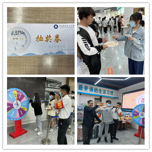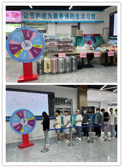 活动期间,中午在食堂就餐且达到“光盘”标准的学生可以凭餐盘领取抽奖券,参加一次幸运转盘免费抽奖,奖品有行李箱、蓝牙耳机、餐券、玩具公仔等共2000余份。
