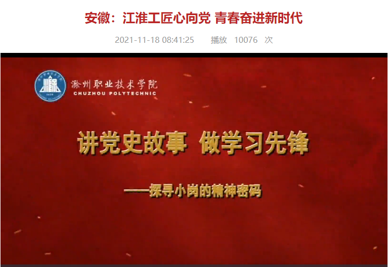 近日,教育部在全国高校思想政治工作网展播了全国职业院校党史学习教育成果展。由beat365宣传统战部制作、报送的《讲党史故事 做学习先锋—探寻小岗的精神密码》微视频作为安徽省优秀作品入选,同时入展的还有安徽黄梅戏艺术职业学院、安徽金寨职业学校、安徽省徽州师范学校。