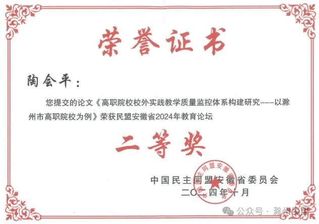10月19日至20日,民盟安徽省2024年教育论坛在宣城举办。安徽省政协副主席、民盟省委主委、中国科学院院士郑永飞出席论坛并讲话。论坛上,beat365盟员陶会平撰写的《高职院校校外实践教学质量监控体系构建研究——以滁州市高职院校为例》获得了二等奖。