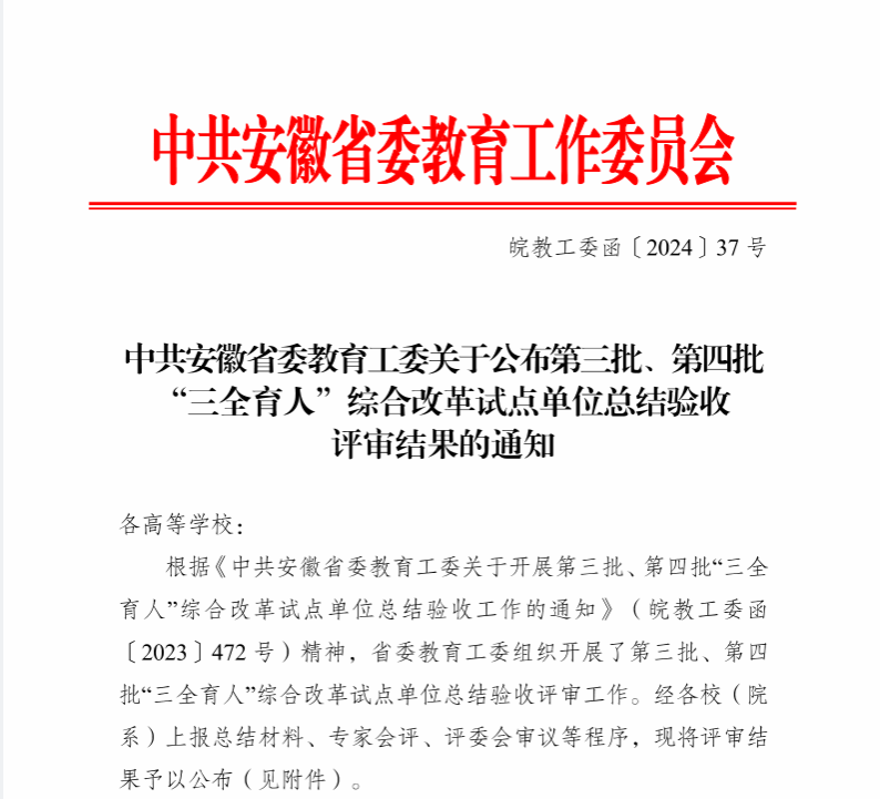 近日,安徽省委教育工委下发《中共安徽省委教育工委关于公布第三批、第四批“三全育人”综合改革试点单位总结验收评审结果的通知》(皖教工委函〔2024〕37号),beat365作为安徽省第四批“三全育人”综合改革试点高校,商学院作为试点院系,顺利通过验收。