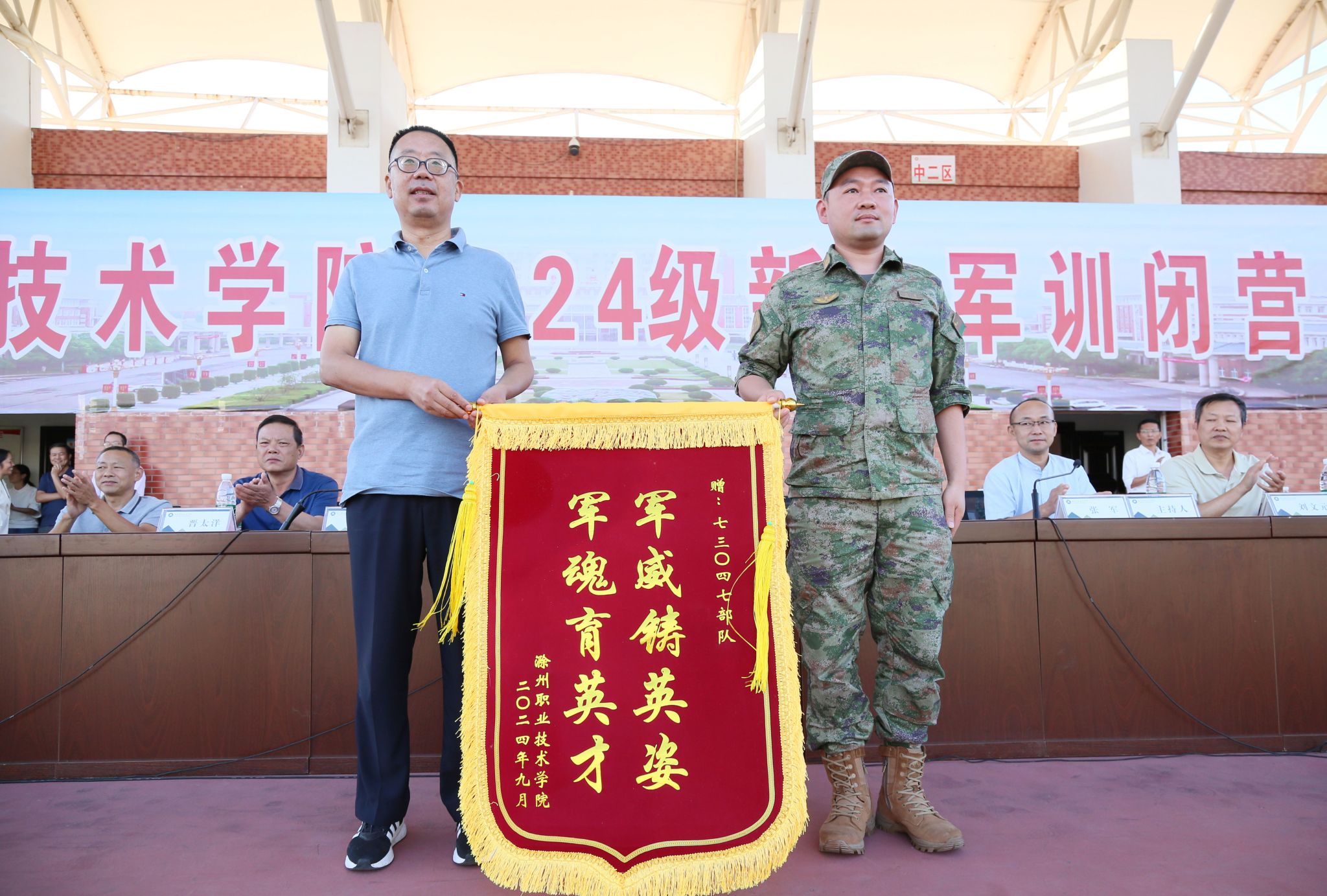 李平权代表学校向承训单位赠送“军威铸英姿,军魂育英才”锦旗,并宣布“beat365在线唯一官网2024级新生军训闭营”。