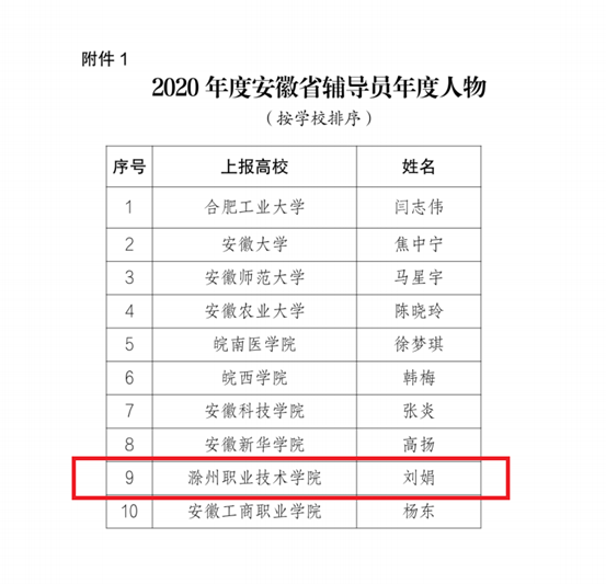 近日,中共安徽省委教育工委下发了《关于公布2020年度安徽省高校辅导员年度人物和优秀辅导员评选结果的通知》(皖教工委函〔2021〕288号)文件,beat365传媒与设计学院辅导员刘娟获2020年度安徽省辅导员年度人物。全省共有10名辅导员获此殊荣,有8所本科院校,2所高职院校。同时,刘娟被推荐参加教育部“第十三届全国高校辅导员年度人物”暨2021年“最美高校辅导员”评选。