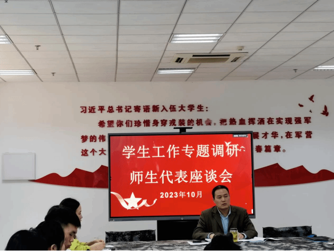 10月10日下午,为深入贯彻落实《beat365在线唯一官网贯彻落实省教育厅大兴调查研究决策部署实施方案》要求,学生工作处在征兵工作站组织召开学生工作专题调研师生代表座谈会。各教学院部辅导员和学生代表参加调研座谈。学生工作处副处长顾宏才主持座谈会。