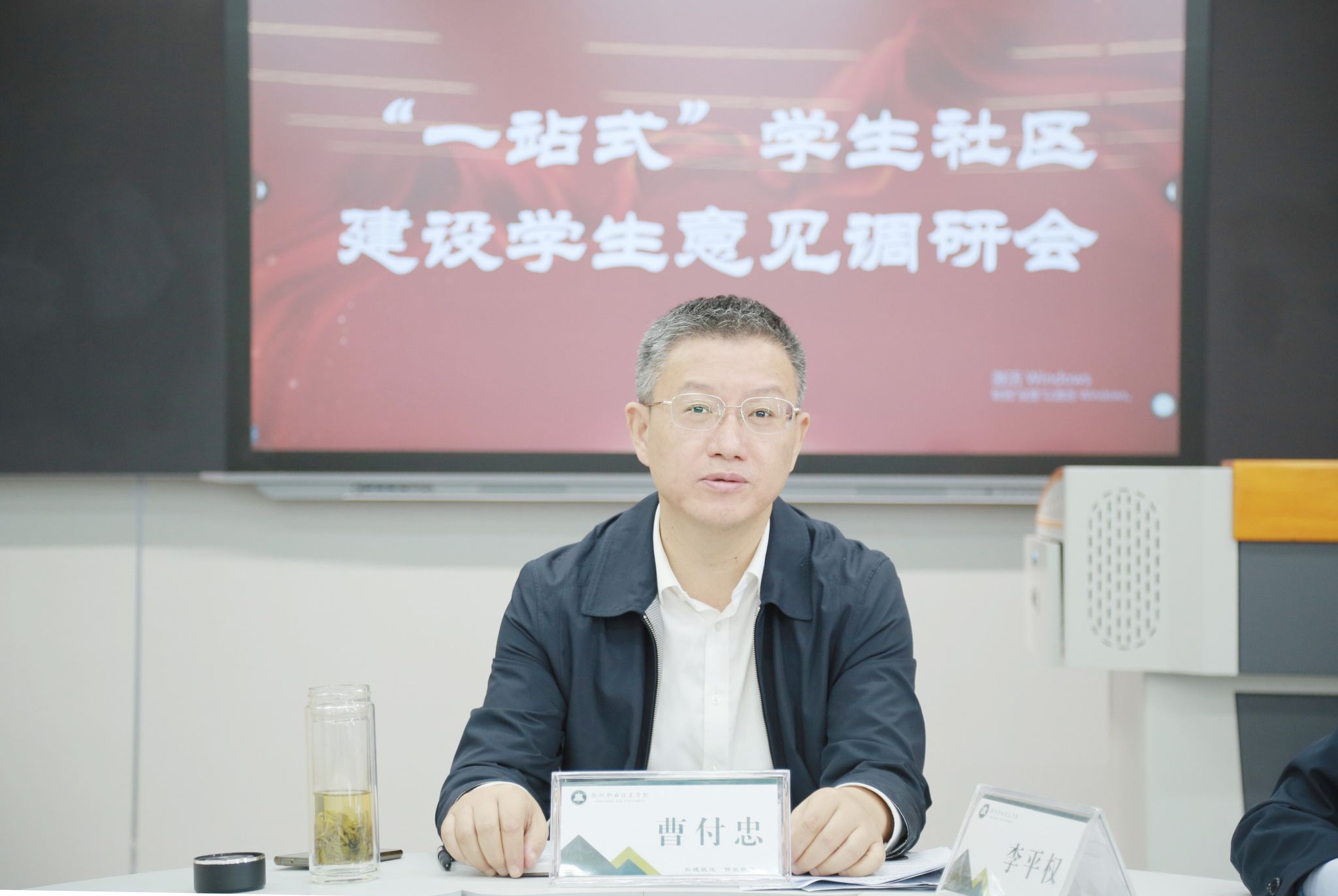 为进一步深入调研和广泛听取师生意见,高质量推进学校“一站式”学生社区建设工作,10月12日,学校在大学生活动中心召开“一站式”学生社区建设学生意见调研会。校党委书记曹付忠出席调研会。校党政办、学生工作处、组织人事处、团委、安全保卫处、总务处、后勤服务中心等相关部门负责人,学校辅导员、学生代表参加调研座谈。校党委委员、校工会主席李平权主持调研会。