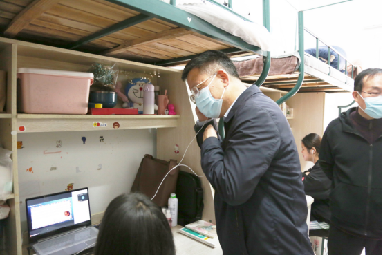 随后,曹付忠一行又先后来到商学院、管理学院、传媒与设计学院学生寝室,通过走访详细了解了学校线上教学开展情况,认真听取同学们对学校线上课程教学质量、封控期间学习生活情况的意见建议。
