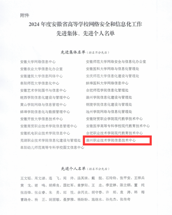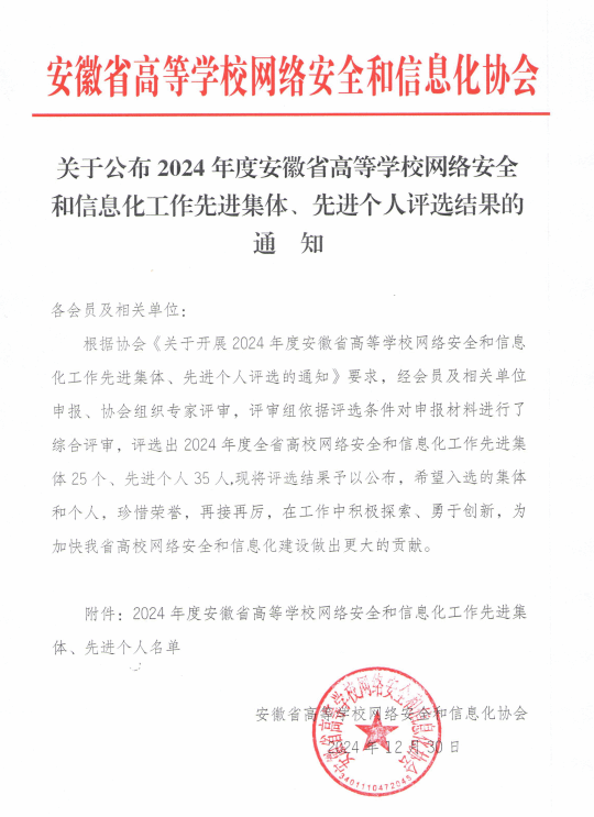 12月30日,安徽省高等学校网络安全和信息化协会发布了《关于公布2024年度安徽省高等学校网络安全和信息化工作先进集体、先进个人评选结果的通知》,beat365信息技术中心喜获“2024年度安徽省高等学校网络安全和信息化工作先进集体”荣誉称号。