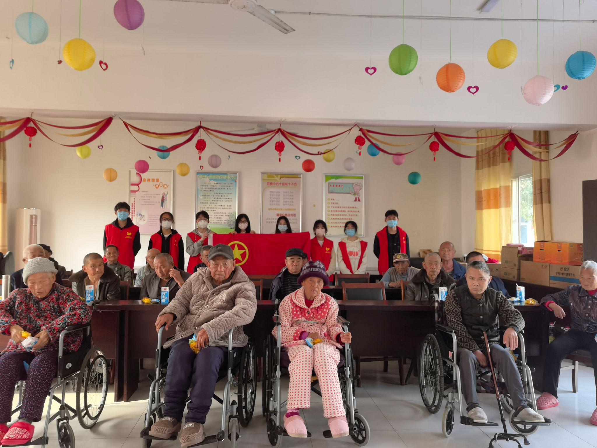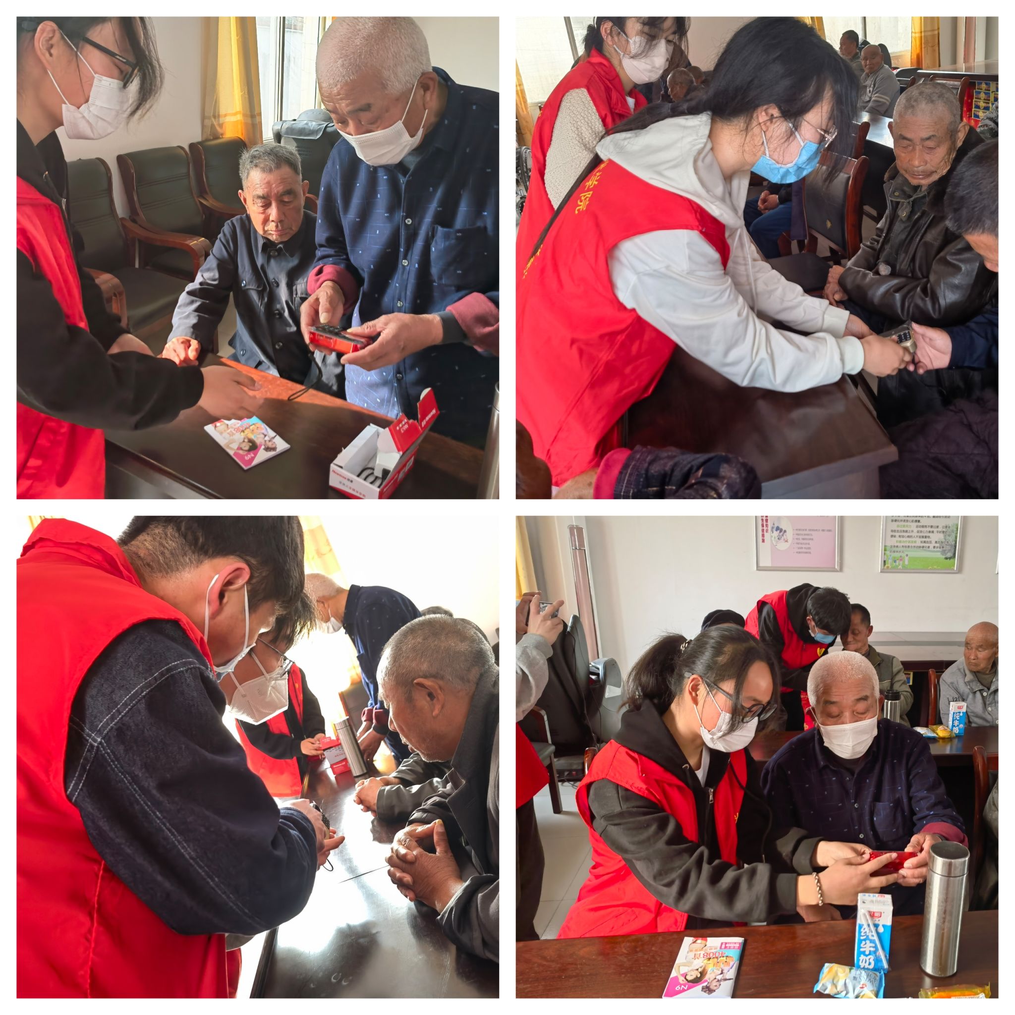 志愿者的到来使敬老院气氛活跃了起来。活动中,同学们帮助工作人员将个别行动不便的老人推到活动室,给老人们带来了精心准备的歌曲《学习雷锋好榜样》,随后同学们把带来的牛奶和面包发给老人们,并给老人们送去了简单易学的老人收音机,耐心指导老人们具体的使用方法,教会他们使用,现场氛围欢快温馨,其乐融融。一时间敬老院里热闹非凡,一抹抹“志愿红”的身影,穿梭于敬老院的每一个角落。