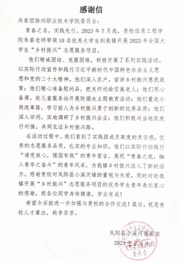 岁月不居,时节如流。在暑期大学生“乡村振兴”专项实践活动即将结束之际,由信息工程学院团总支书记朱睿带队的“滁州市青志协大学生志愿服务队” 实践团收到了来自凤阳县小溪河镇的一份感谢信。