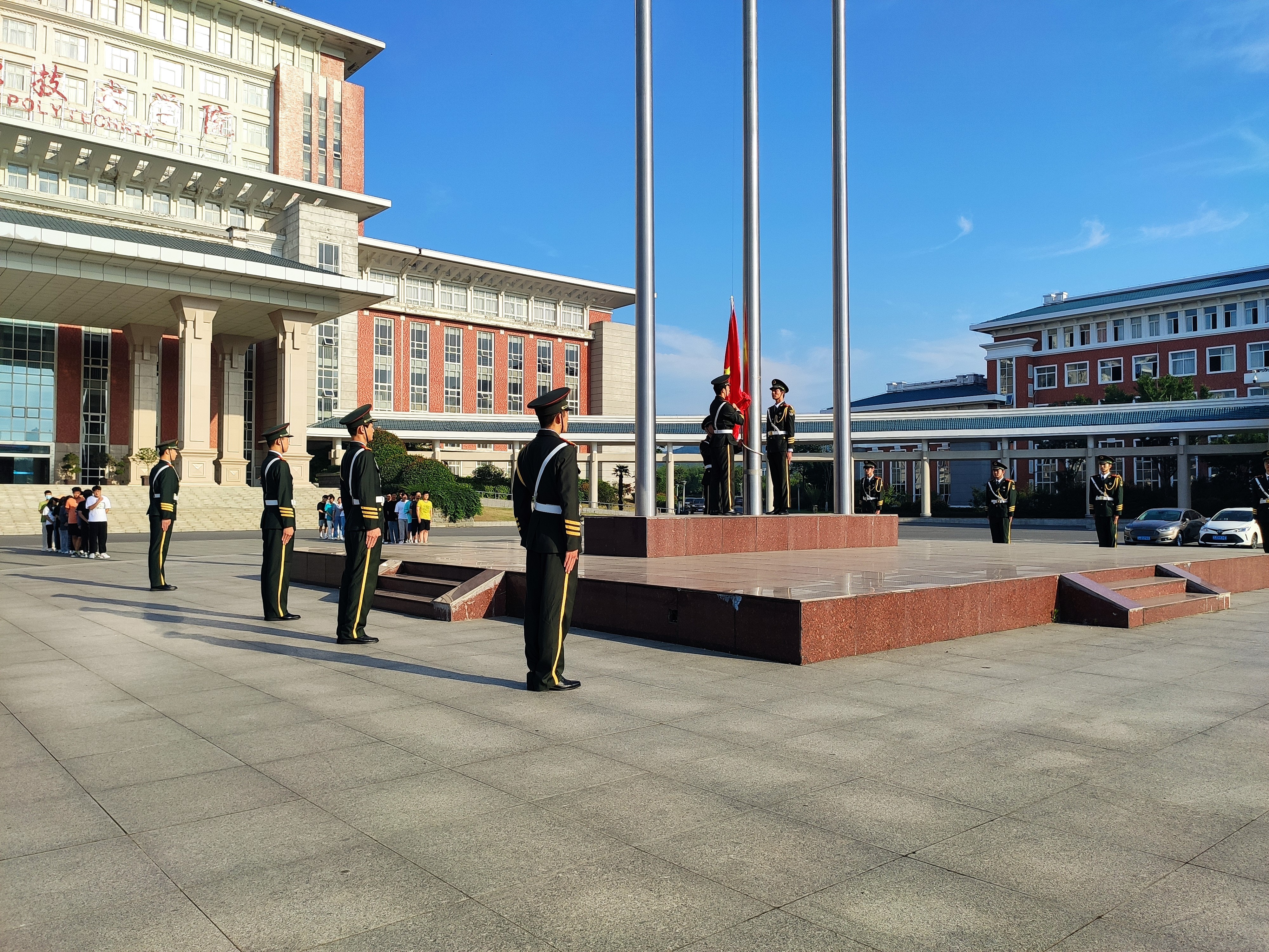 上午7时,参与同学准备就位。现场随着仪仗队的出现而安静下来。庄严的仪仗队护卫着国旗走入场内。国旗护卫队的队员们迈着整齐的步伐,护送国旗入场,伴着庄严嘹亮的国歌,升旗仪式正式开始,全体共青团工作者庄严肃立,鲜艳的五星红旗迎着朝阳冉冉升起,在场所有同学无不心潮澎湃,精神振奋,对党和国家的无限热爱之情在心中升腾。