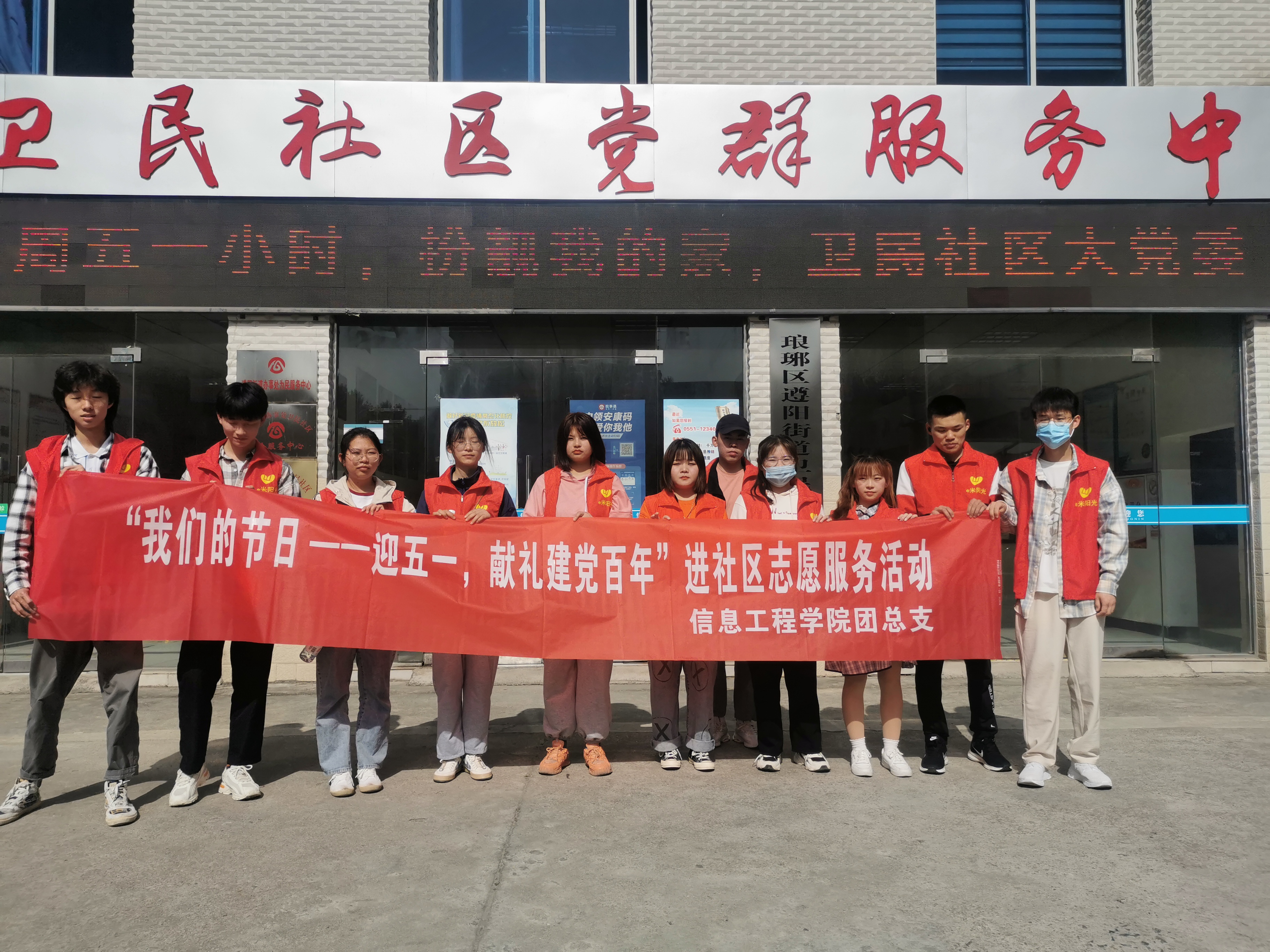 春风送暖山河美,万象更新锦绣春。在五一国际劳动节来临之际,为大力弘扬“奉献、友爱、互助、进步”的志愿服务精神,献礼建党百年。2021年4月30日下午,信息工程学院团总支负责老师朱睿组织我院11名团员青年前往卫民社区开展“迎五一,献礼建党百年”进社区志愿服务活动。