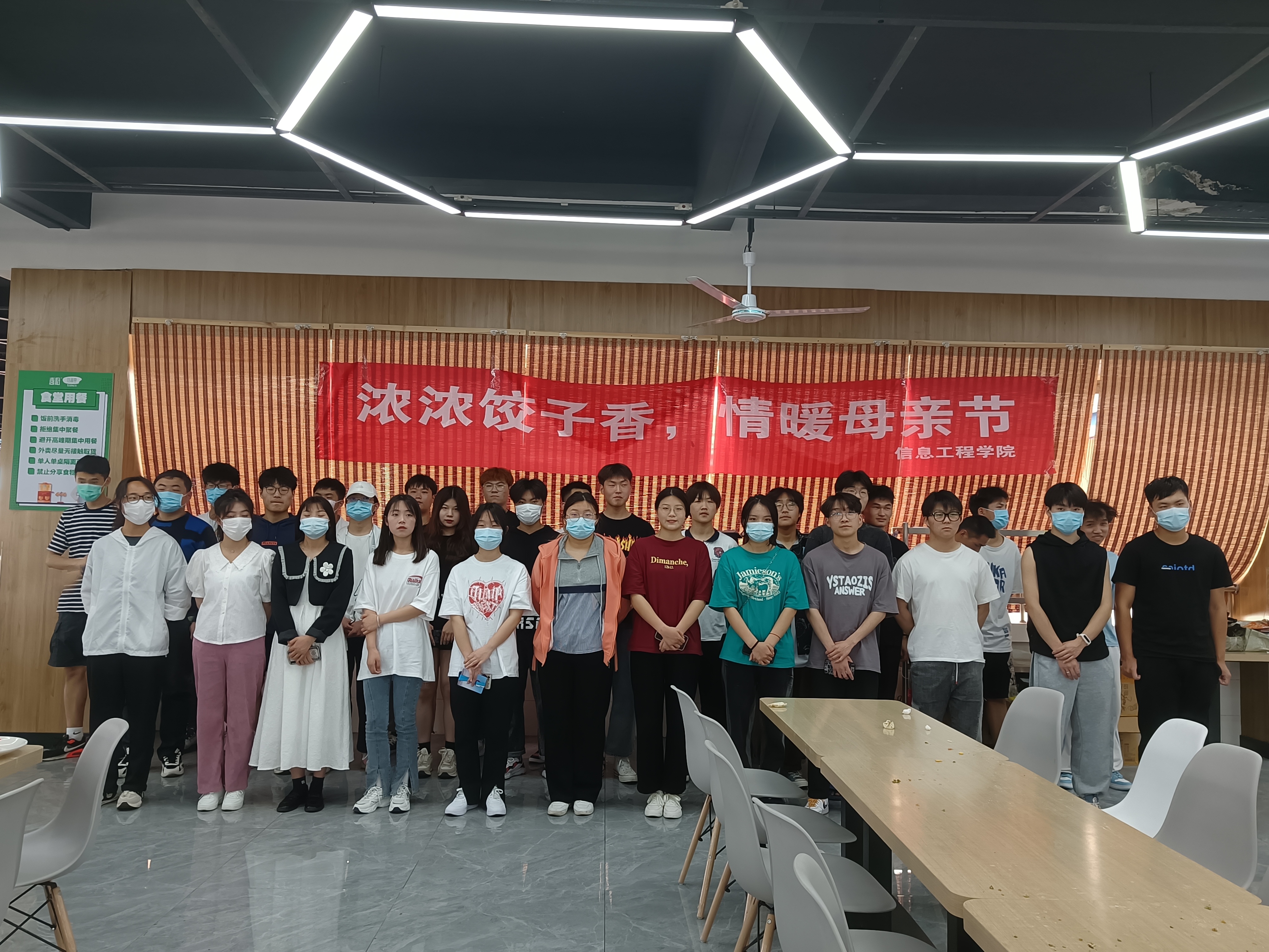 为丰富同学们的课余生活,弘扬中华民族的传统美德,营造浓厚的母亲节节日氛围。5月8日下午,信息工程学院团学组织在食堂三楼开展了“浓浓饺子香,情暖母亲节”主题包饺子活动。