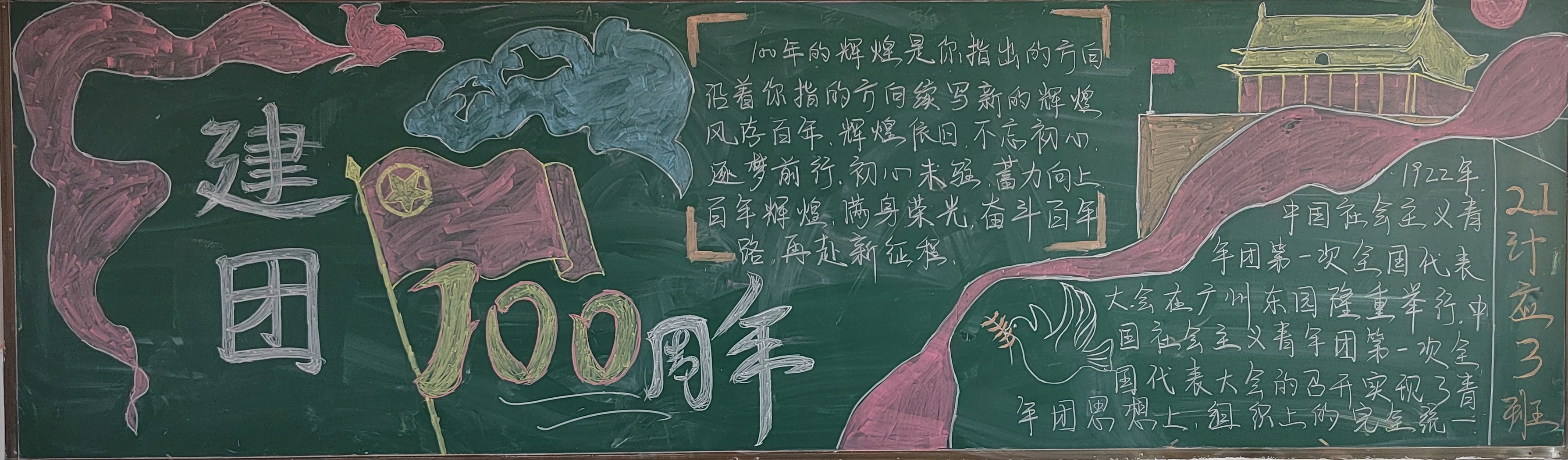 活动中,各班同学们认真策划,精心准备,制作出一面面主题鲜明、内容丰富、设计新颖、图文并茂、色彩绚丽的黑板报,用五彩斑斓的画笔描绘出共青团宏伟的历史蓝图,用朴实而生动的文字讲述共青团的发展史,展示共青团光辉的100年,字里行间洋溢着对共青团的无比热爱之情。活动结束后,学生会对各班级所创作的板报进行了认真评选,最终一等奖1名,二等奖2名,三等奖4名。其中,21级虚拟现实班级荣获一等奖。