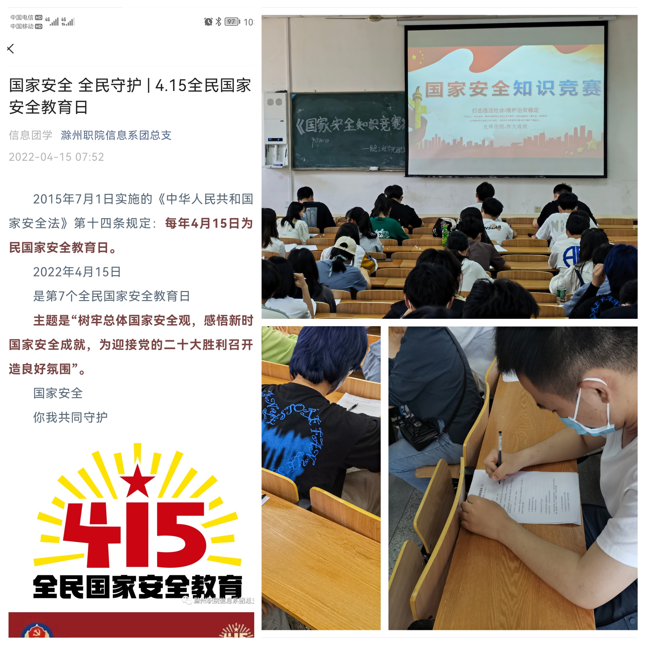 此外,我院团总支在微信公众号发布了国家安全教育日知识普及并开展了国家安全知识竞赛活动。院部各班级也积极动员学生登录国开学习网在线学习“国开大讲堂·国家安全教育公开课”,同时组织学生学习《beat365在线唯一官网 “互联网+415 国家安全专题学习”》,活动均取得了良好地反馈。