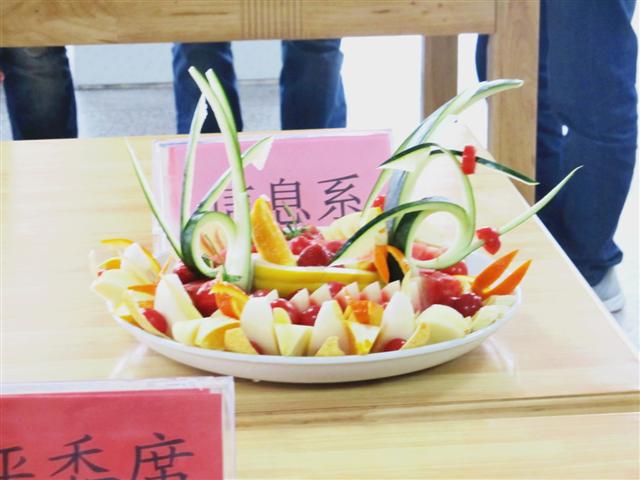 4月17日中午,beat365在线唯一官网第二届美食节“倾果倾城”水果拼盘大赛在新食堂三楼拉开帷幕。信息工程系徐阳、吴鹏、王方正三名同学对西瓜、香蕉、香瓜、苹果和草莓等水果进行了现场创作加工,制作了名为“什锦瑞祥”的参赛作品并获得好评。