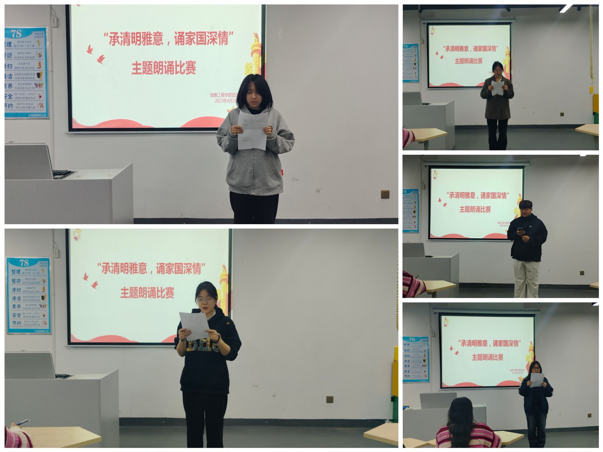 为引导我院学子在清明时节缅怀先烈、追思故人,激发家国情怀,4月2日晚,信息工程学院团总支组织学生在致善楼2601教室成功举办了“承清明雅意,诵家国深情”主题朗诵比赛。