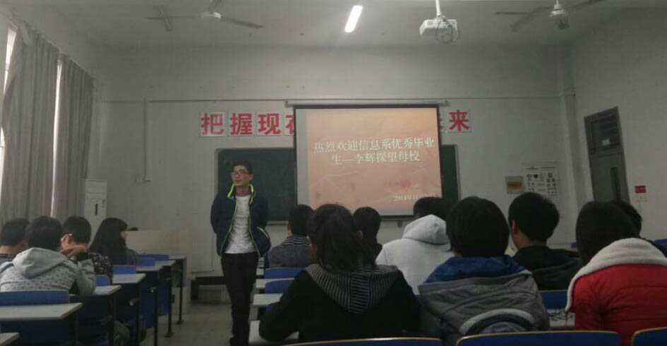 11月26日下午,信息工程系在2113教室举办了优秀毕业生回校演讲活动。14级嵌入式专业的学生参加了此次活动。此次讲座邀请的嘉宾是我系08级软件班的优秀毕业生李辉,现任职南京摩乐投资管理咨询有限公司行政部副经理。