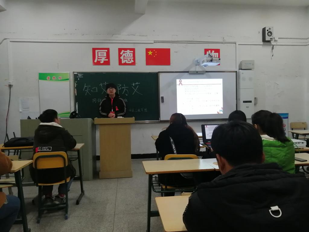 活动开始前,团总支副书记刘畅组织共青团工作者们为大家发放了艾滋病胸标,点明此次活动的主题。活动中,由19级团支部书记钱召阳主持,以PPT的方式为大家讲解了艾滋病的主要内容,用真实的案列、大量的数据、图片和现场演示讲解出何为艾滋,怎样预防艾滋,让同学们更加深入的了解艾滋病,并意识到预防艾滋的重要性。