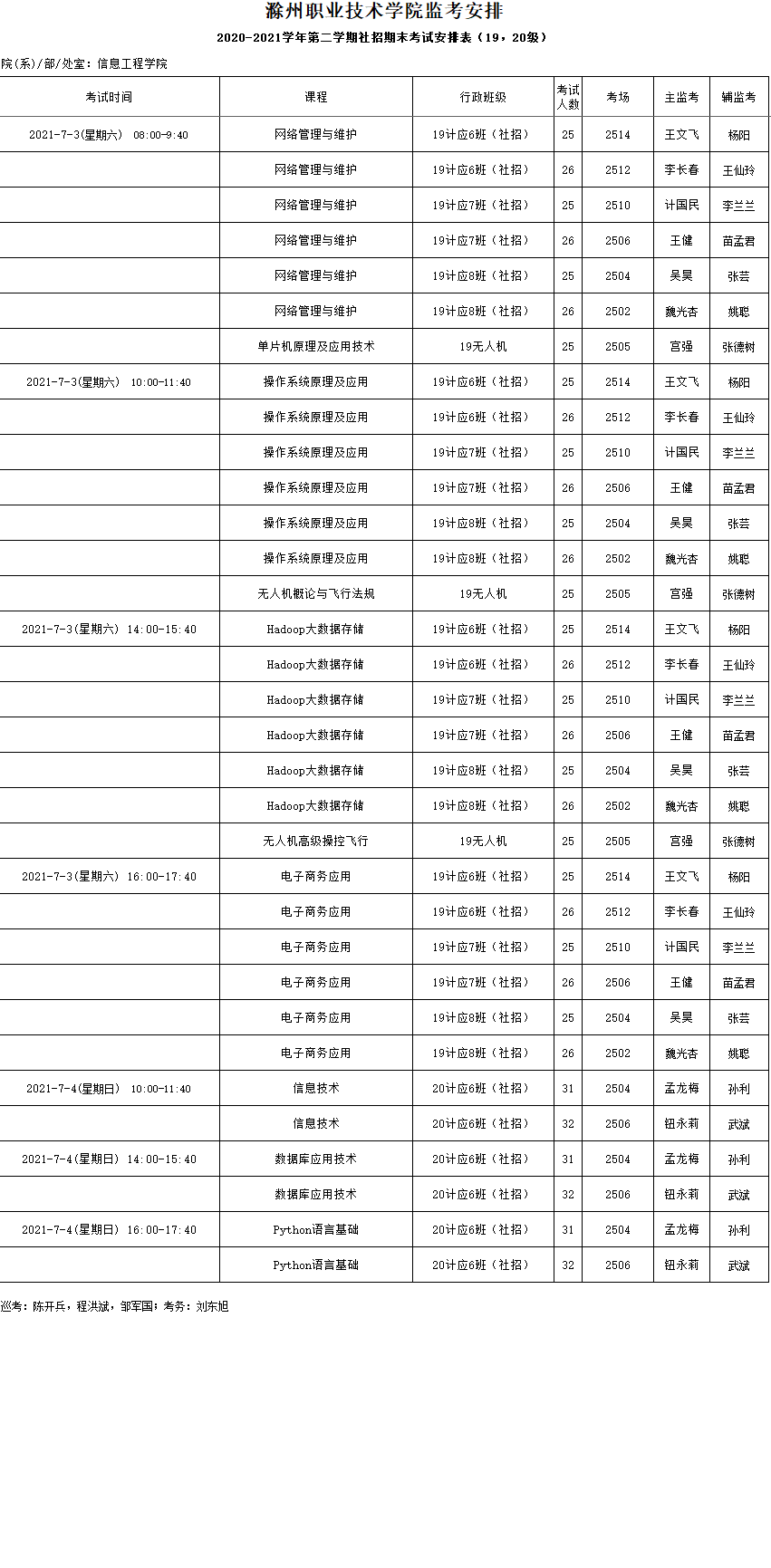 信息工程学院2020-2021学年第二学期社招期末考试安排表(19,20级)。