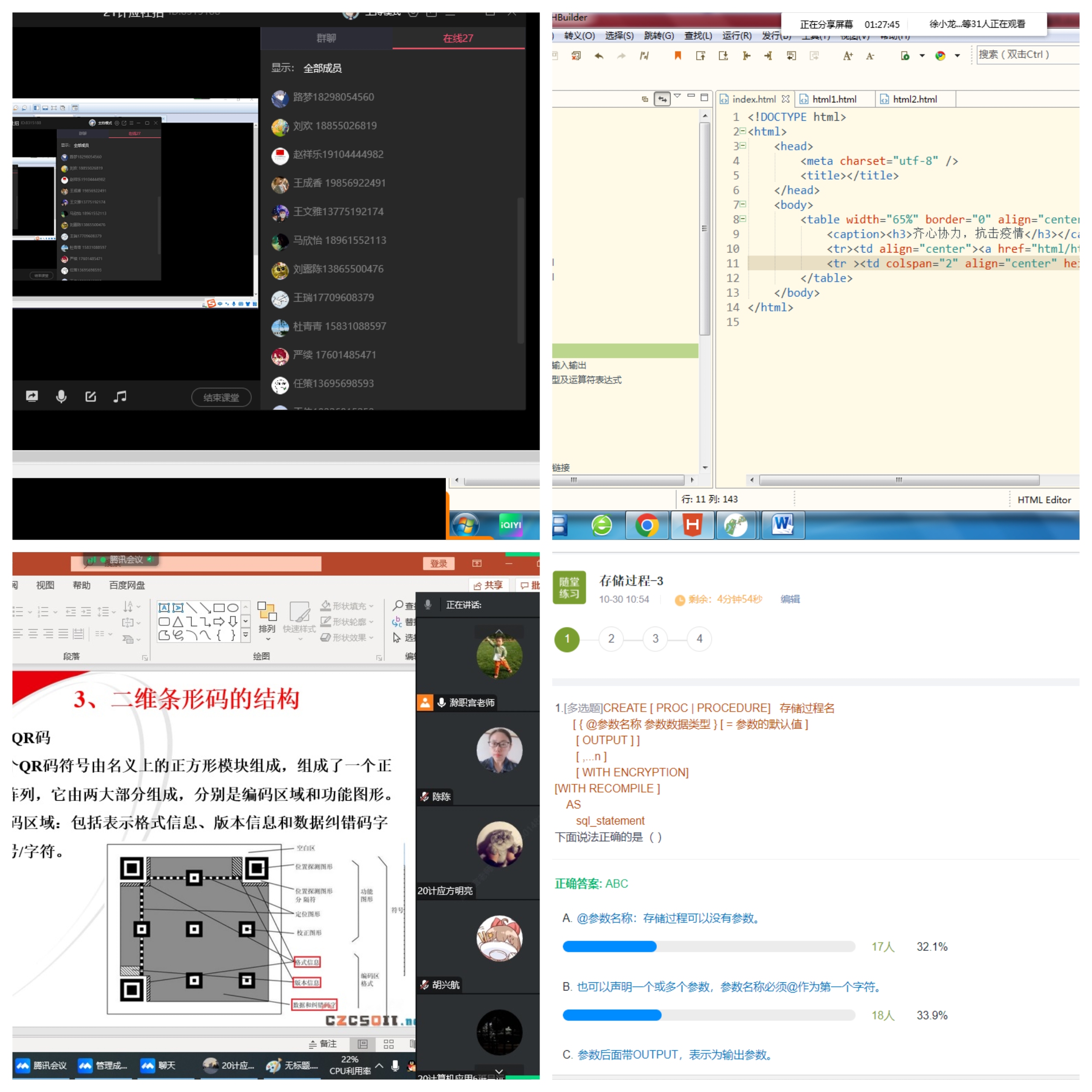 10月29日、30日我院积极开展了20级、21级社招班的第二次线上直播授课,各授课老师精心谋划,借助学习通、钉钉等平台或软件,采用了腾讯会议、班级群QQ屏幕共享等直播形式,给学生们送上了一堂堂精彩纷呈、有趣高效的直播课。学生自律配合,自觉遵守课堂纪律,按时到课听讲,认真完成作业,共同守护“云课堂”。