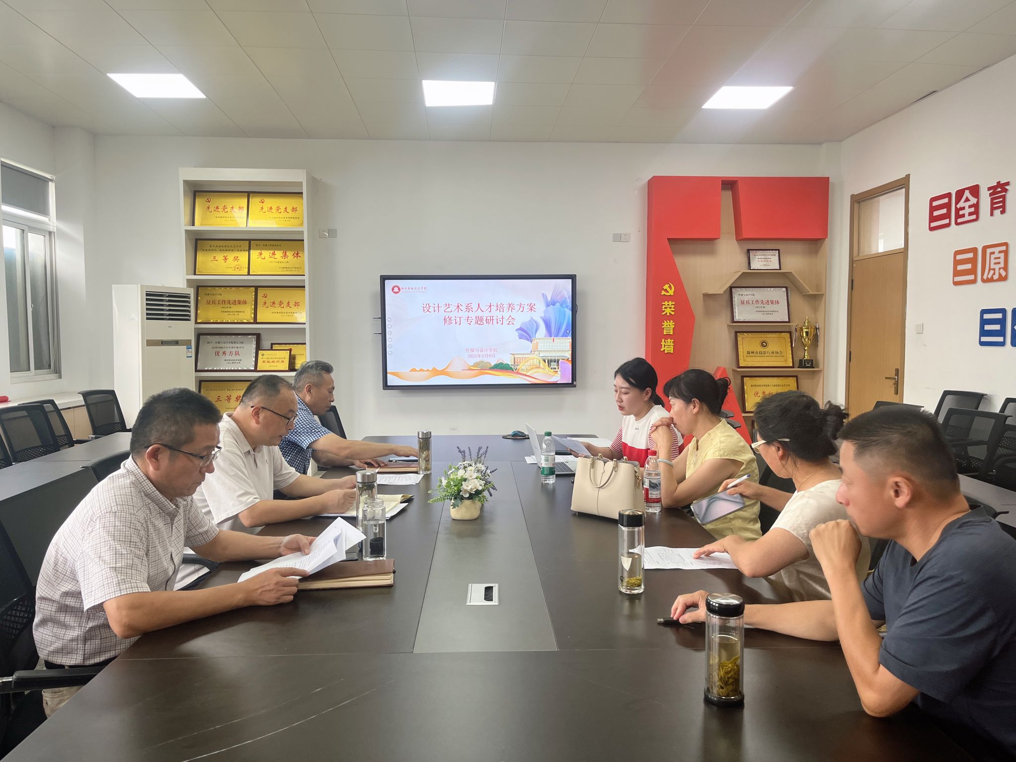 2025年8月8日下午,传媒与设计学院设计艺术系于德馨楼302会议室组织召开2025级专业人才培养方案修订专题研讨会。学院党总支书记王广保、院长闻建强、副院长杨之武,设计艺术系主任薛梦琪,以及室内艺术设计专业负责人黄瑞、艺术设计专业负责人王晓玮、工业设计专业负责人王起参加会议。