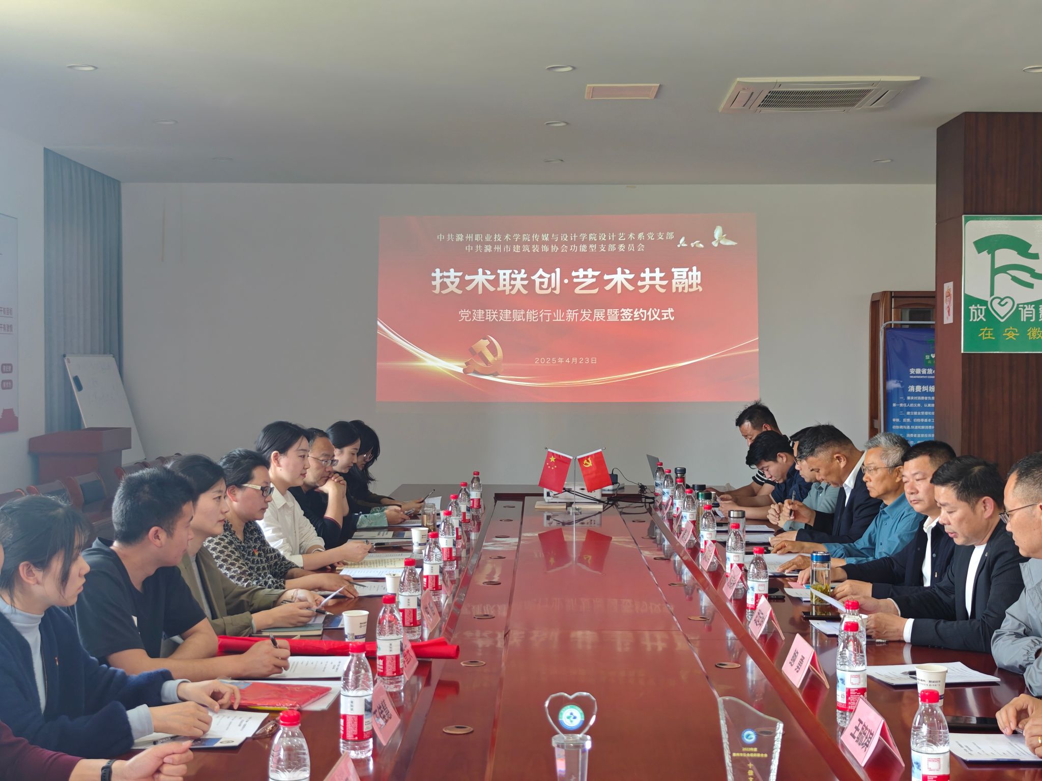 为深入学习贯彻习近平新时代中国特色社会主义思想,贯彻落实新时代党的建设总要求,充分发挥党组织在推动教育发展、服务地方经济中的引领作用,进一步深化校企合作,创新党建工作模式,4月23日下午,设计艺术系党支部一行前往滁州市建筑装饰协会,与滁州市建筑装饰协会党支部正式签署“党建联建”合作协议,并联合开展了“技术联创·艺术共融——党建联建助力行业新发展”主题党日活动,开启了校企党支部携手共进、共同发展的新局面。