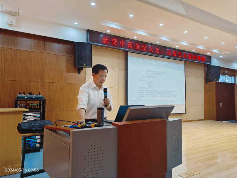 讲座期间,蒋红雨教授从传统文化在设计中的运用、感受中国传统文化——中国画、由中国画中的元素设计出的作品举例三个部分展开阐述。首先,讲述了书法艺术、古钱币、图案纹样、篆刻艺术再设计中的广泛应用,蒋教授表示中华优秀传统文化源远流长、博大精深,是当下设计的基石与源泉。