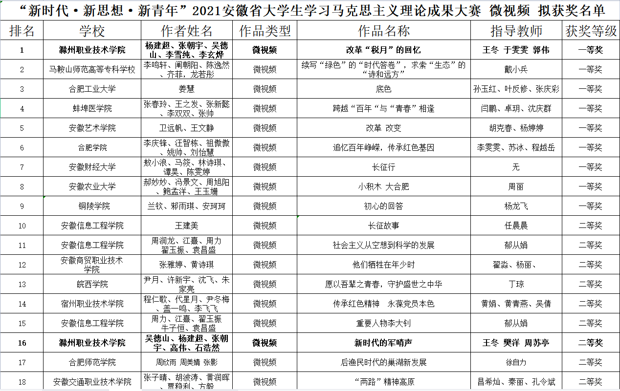 近日,由安徽省教育厅主办、合肥工业大学承办的2021年“新时代·新思想·新青年”安徽省大学生学习马克思主义理论成果大赛顺利结束。本次大赛采取线上提交作品、评委网络评选的方式进行。