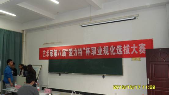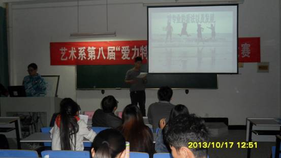 为帮助学生更好地树立职业目标,增强学习动力,艺术设计系在2013年10月17日中午十二点,在艺术楼102室举办了由艺术系各班学生参加的第八届“爱力特”杯大学生职业发展规划大赛。此次活动由艺术设计系辅导员和学生会指导老师对参赛学生进行评分。