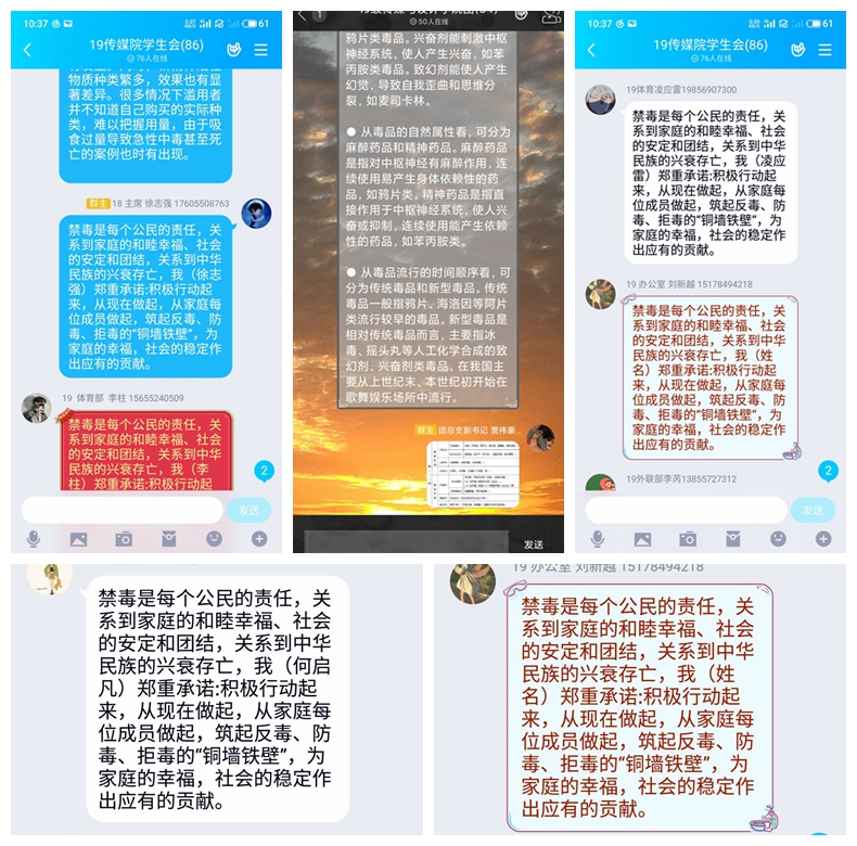 禁毒承诺活动由学生会主席徐志强带头承诺,他先讲到禁毒知识,让大家认识到禁毒是每个公民的责任,关系到家庭的和睦幸福、社会的安定和团结,关系到中华民族的兴衰存亡,最后同学都在QQ群里面发表承诺,从现在做起,从家庭每位成员做起,筑起反毒、防毒、拒毒的铜墙铁壁”。