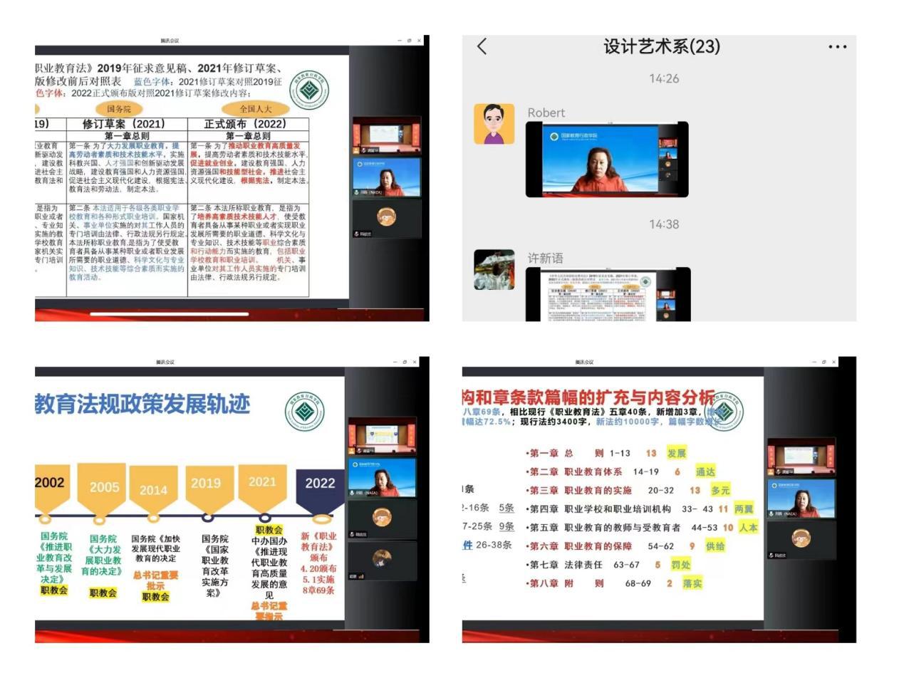 为深入贯彻落实全国职业教育大会精神,做好新职业教育法普法工作,全面准确解读新职业教育法,持续推进依法治教、依法办学,扎实推动职业教育高质量发展,2022年5 月18 日下午14:00-16:30,安徽省地方技能型高水平大学联盟(G33+联盟)特组织“学习《职业教育法》主题报告会”,传媒与设计学院设计艺术系组织全体教师在线上认真学习了《职业教育法》主题报告会。
