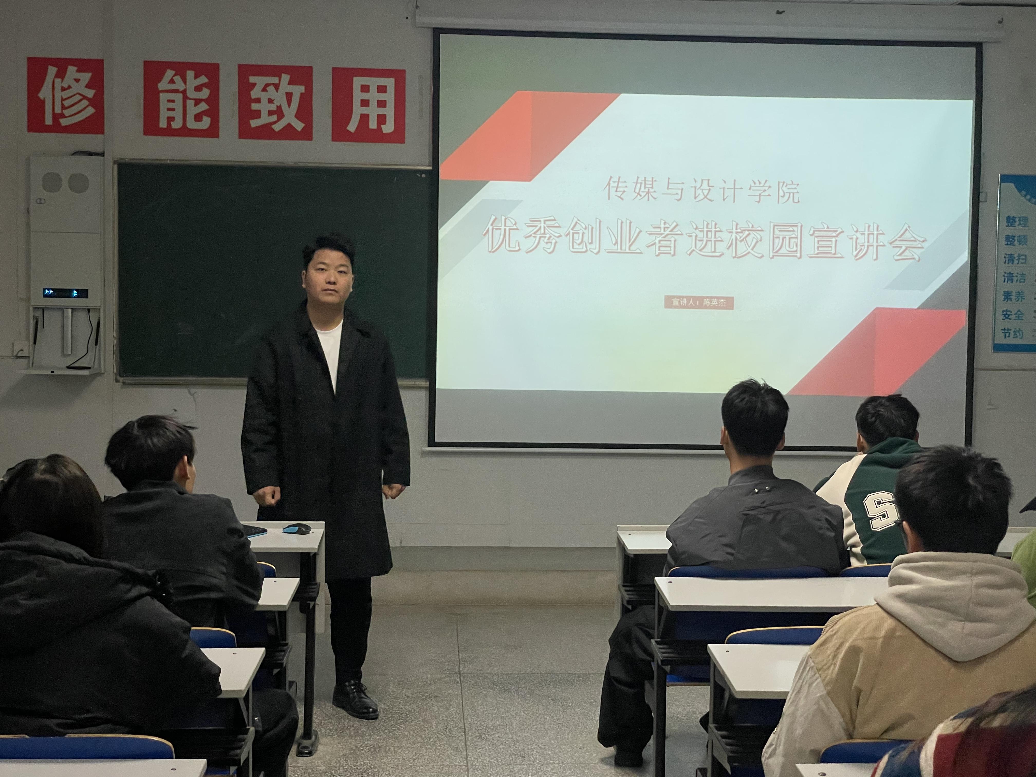 11月16日下午,传媒与设计学院设计艺术系在4102阶梯教室承开展“优秀创业进校园”宣讲活动,辅导员、相关教师及20级室内设计班学生参加活动。活动由设计艺术系主任黄瑞主持、beat365在线唯一官网17级建筑装饰工程技术专业优秀毕业生、天地公司主案设计师陈英杰应邀主讲。