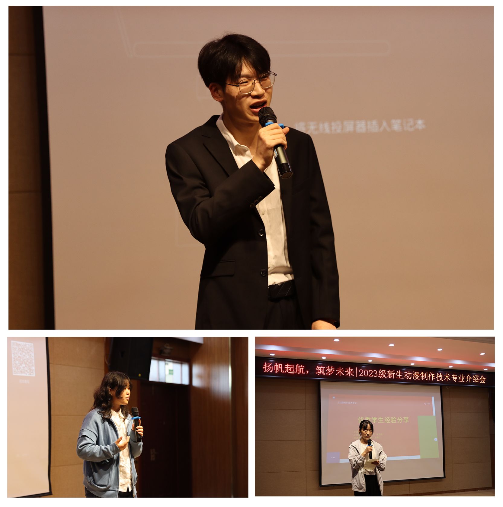 接着,动漫专业学长学姐们分别分享了他们的学习心得和获奖体验。21动漫1班学生王梦瑶分享了她今年获得安徽省大学生广告设计大赛动画类一等奖的经验,她鼓励同学们要勇于尝试、不断进步。同时,21动漫3班(中外合作)朱浩然同学也分享了他学习动画的经验,他表示要善于观察生活、发掘灵感,注重团队合作和实践能力的培养。此外,22动漫4班五年制王乾红同学也分享了她获得大广赛平面类一等奖的经验和心得,她强调了学习和思考的重要性,并鼓励新生们要坚持不懈地追求自己的梦想。