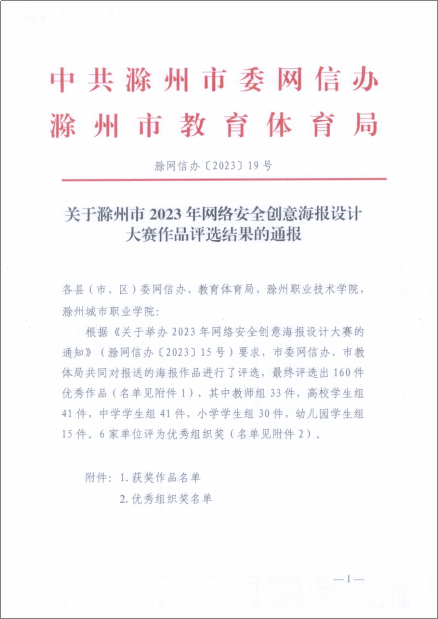 近日,滁州市委网信办、市教体局联合组织的2023年网络安全创意海报设计大赛作品评选结果公布,beat365师生争创佳绩,陈潇潇、阚迪、朱睿三位指导教师带领同学们斩获一等奖两项、二等奖两项。